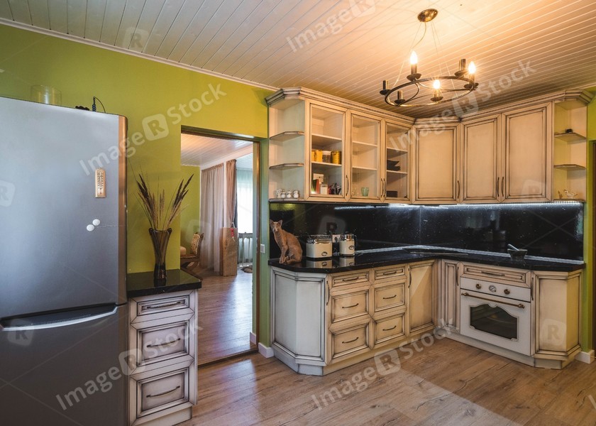 Modern interior of private country house. White kitchen set in country style. Green wall. Fridge. Cat Sphinx.