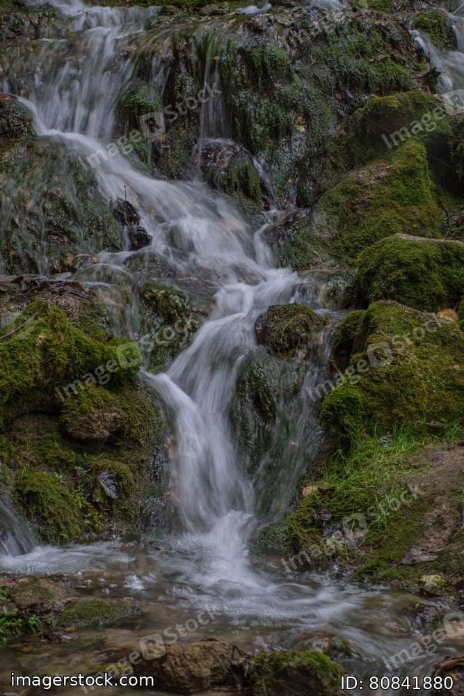 Waterfall in the forest. Green moss and stones. Summer.