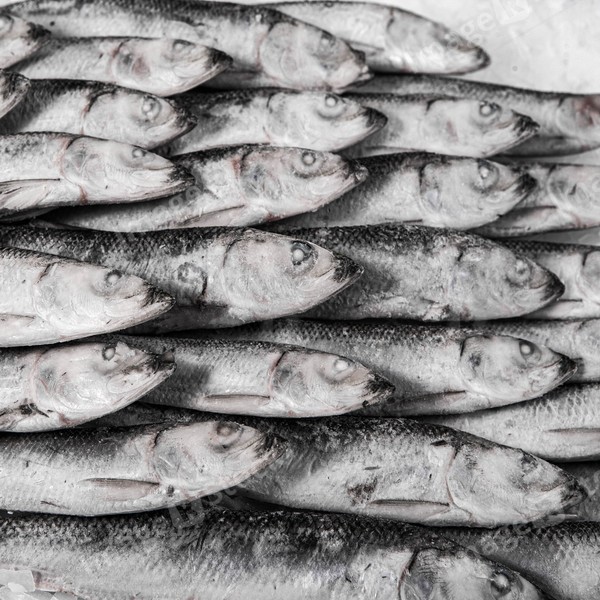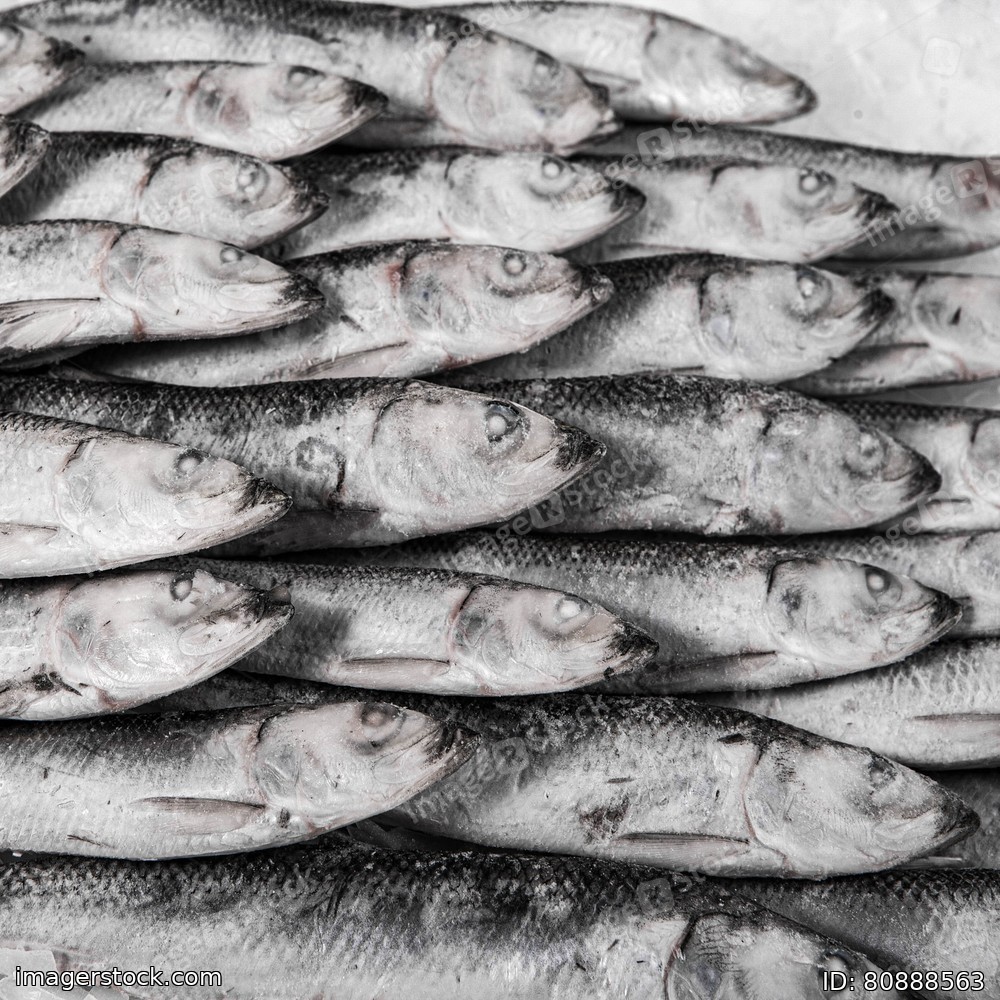 Close-up of fresh sprat on the ice in fish market. Winter fishing. Small silver fish production.