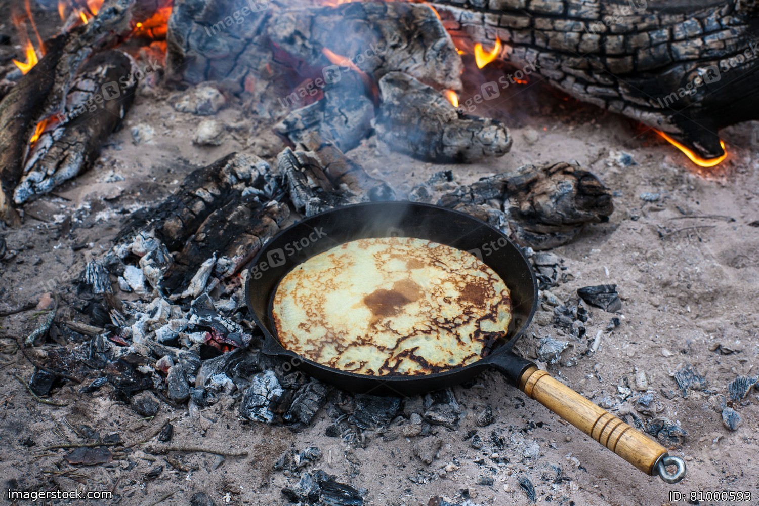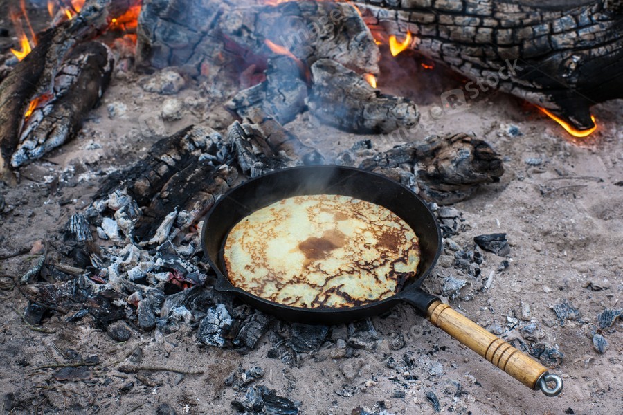 Cooking pancakes on the fire in the forest.