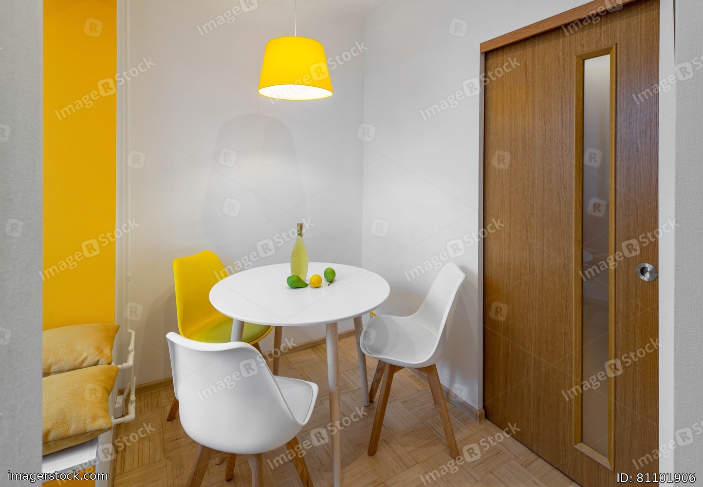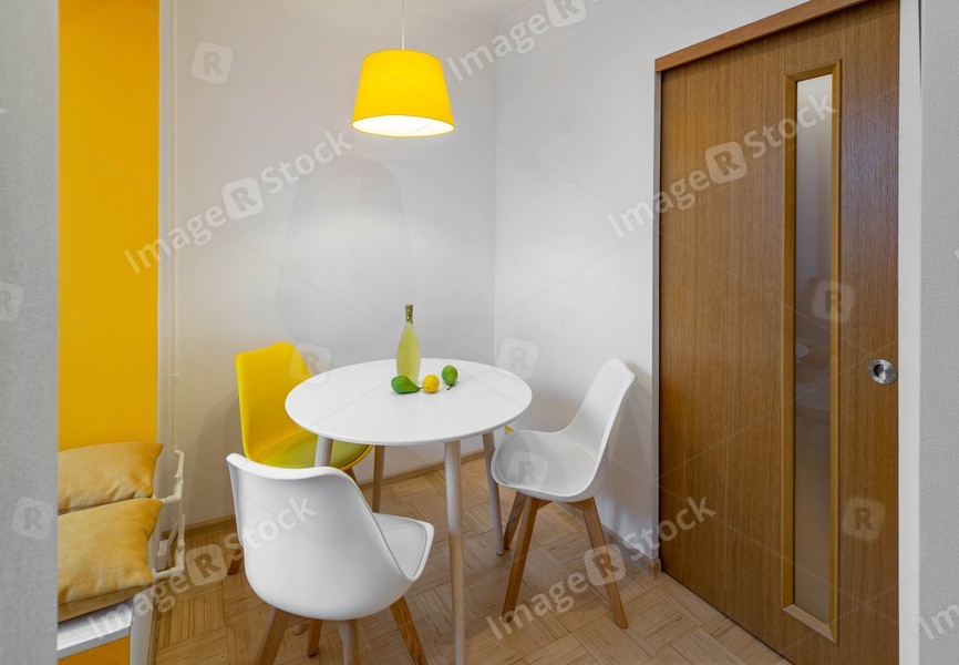 Contemporary interior of modern flat. White walls. Fruits and drink on white table. Wooden door.