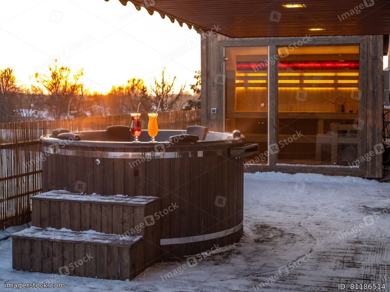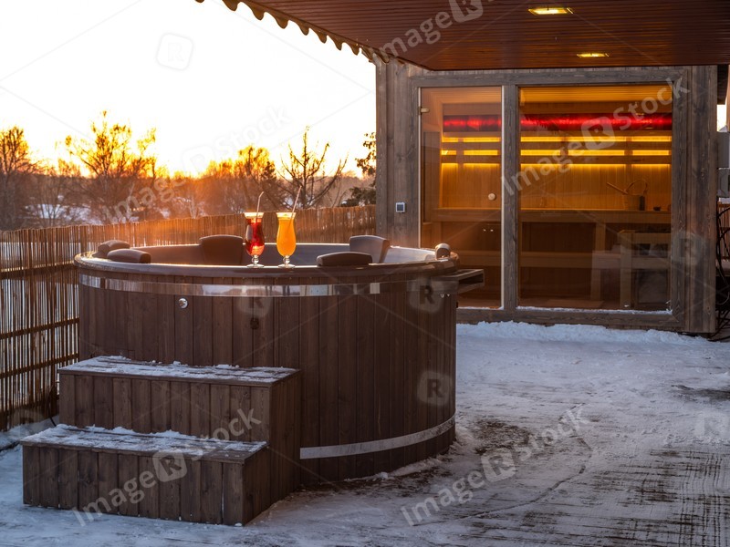 Hot outdoor wooden bath tub on terrace of private house. Finnish sauna