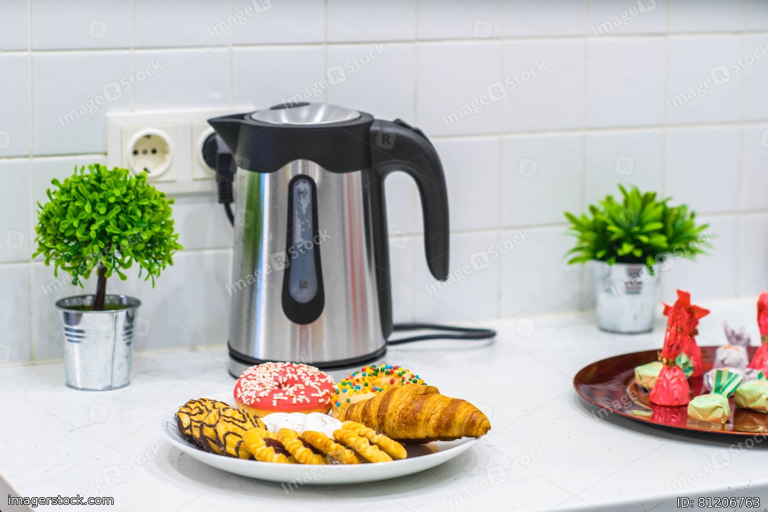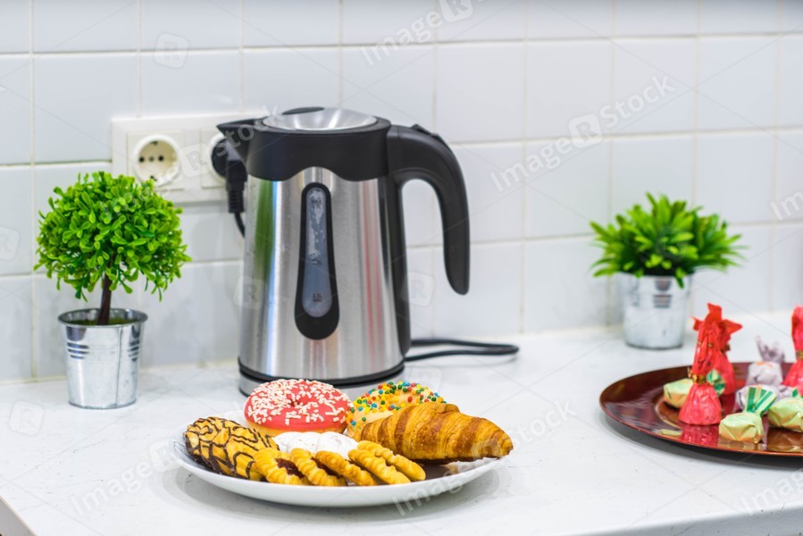 Close up of dish with cookies and donuts. White tile. Kettle and decor.