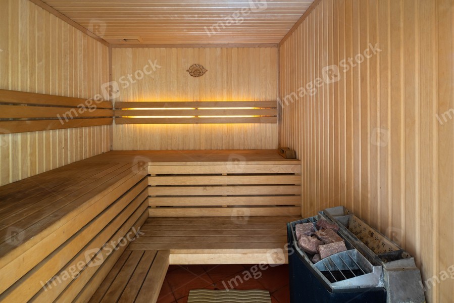 Modern nterior of wooden finnish sauna. Lamp on the wall. Stones on electric stove.