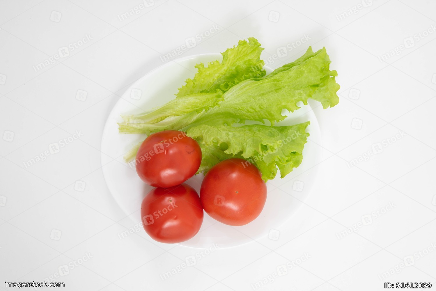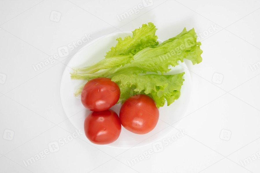 Close up of cherry tomatoes and lettuce on a white background. Healthy food.