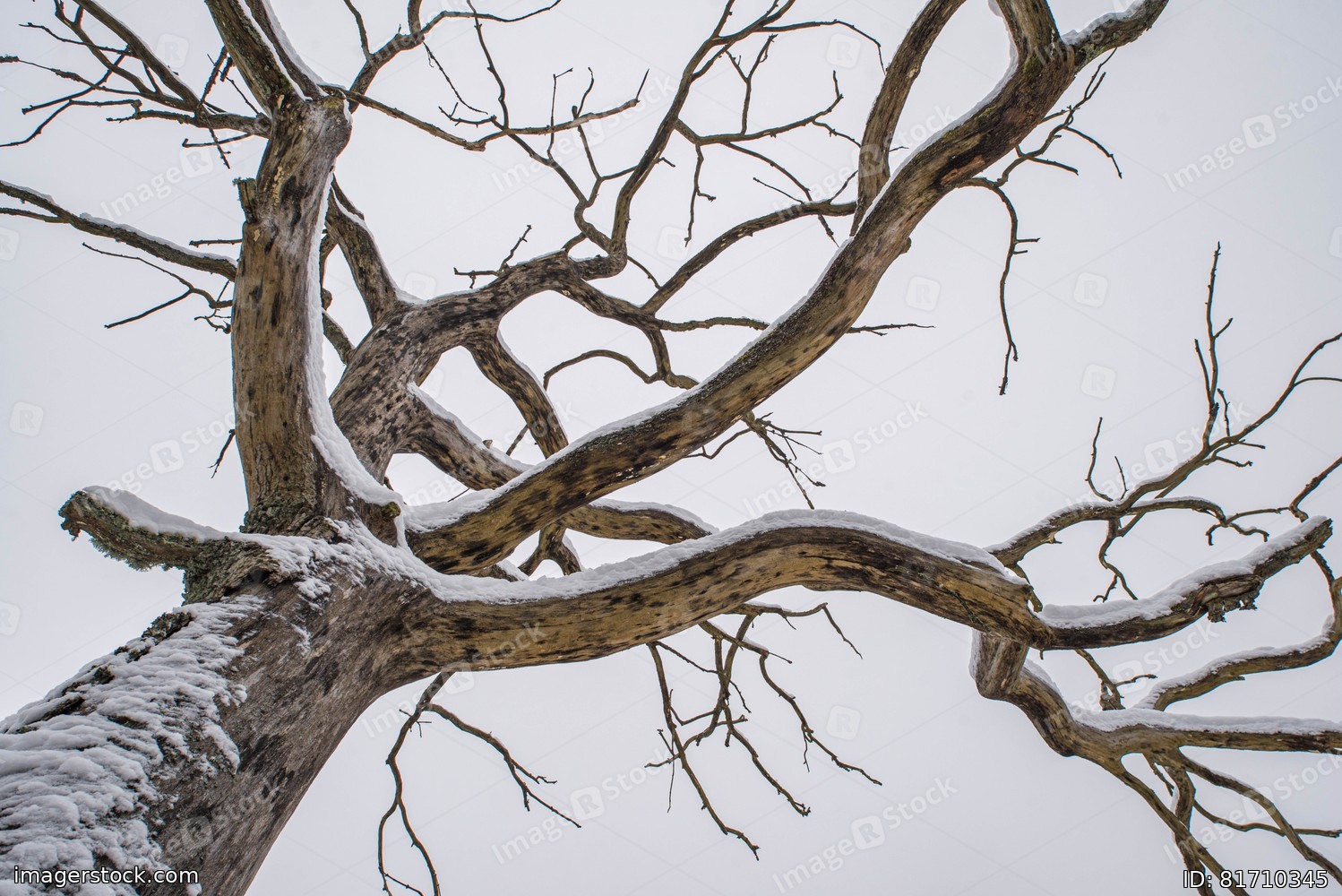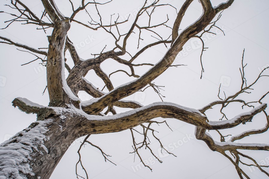Cloude weather. Winter season. Snow on the branches of dead tree. Close-up.