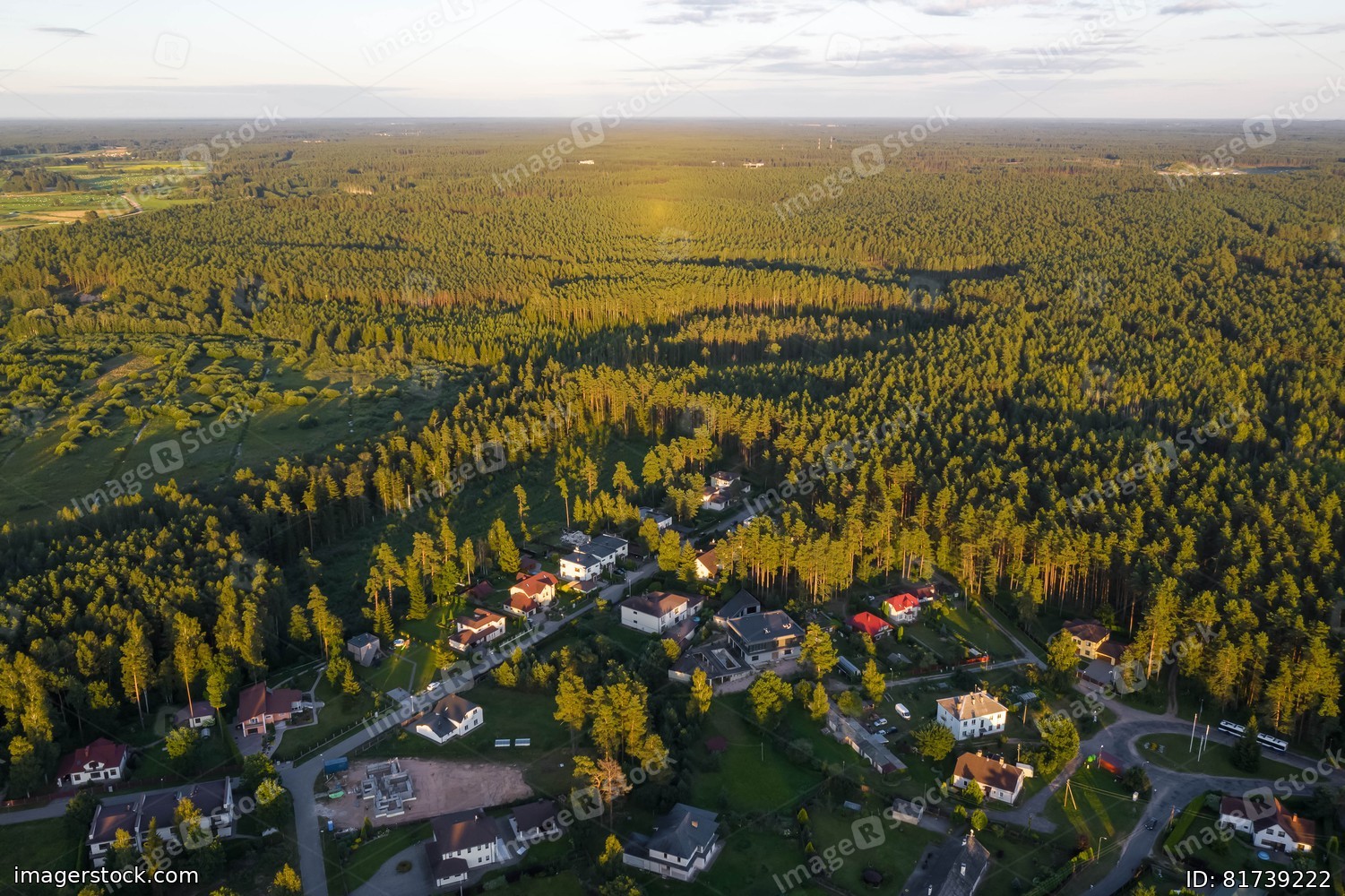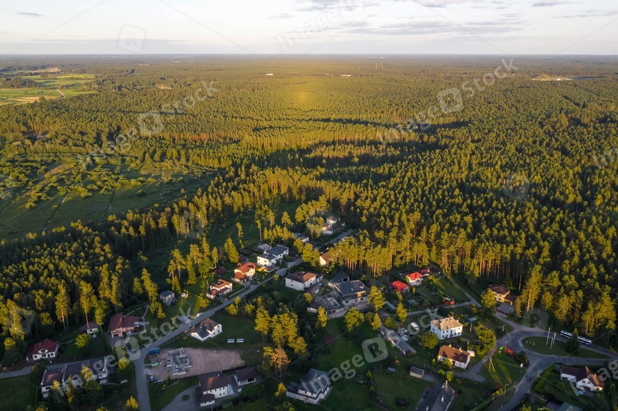 Panorama view from above of private sector of modern european city near the green forest. Contemporary architecture. Summer cityscape. Sunset light.