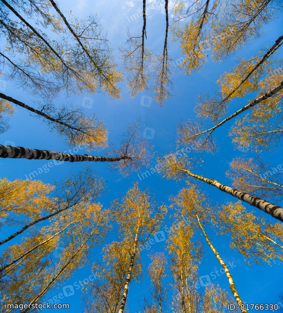 Birches view from below upwards, autumn, yellow leaves. Landscape.