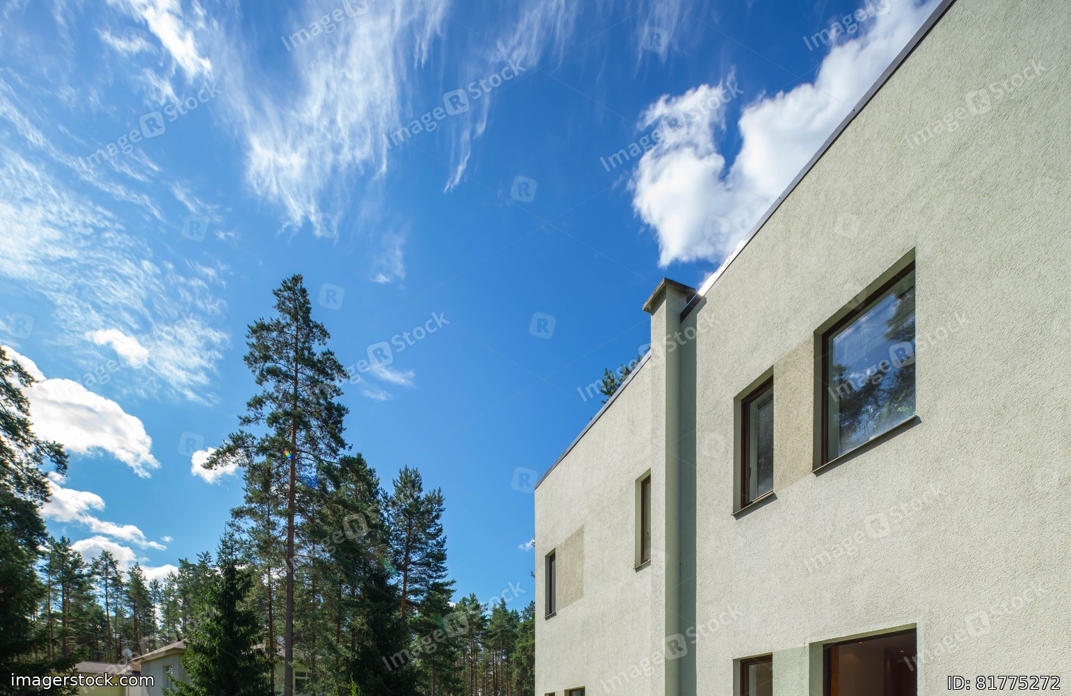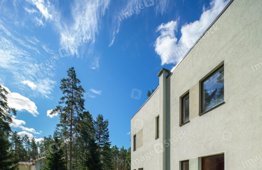 Exterior of cottage. View of white wall with windows. Blue cloudy sky. Pine forest. Private house.