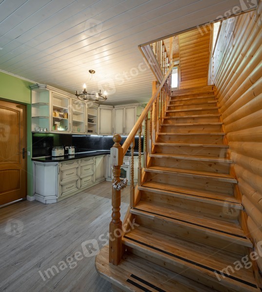 Modern interior of private country house. White kitchen set. Wooden stairs to the second floor.