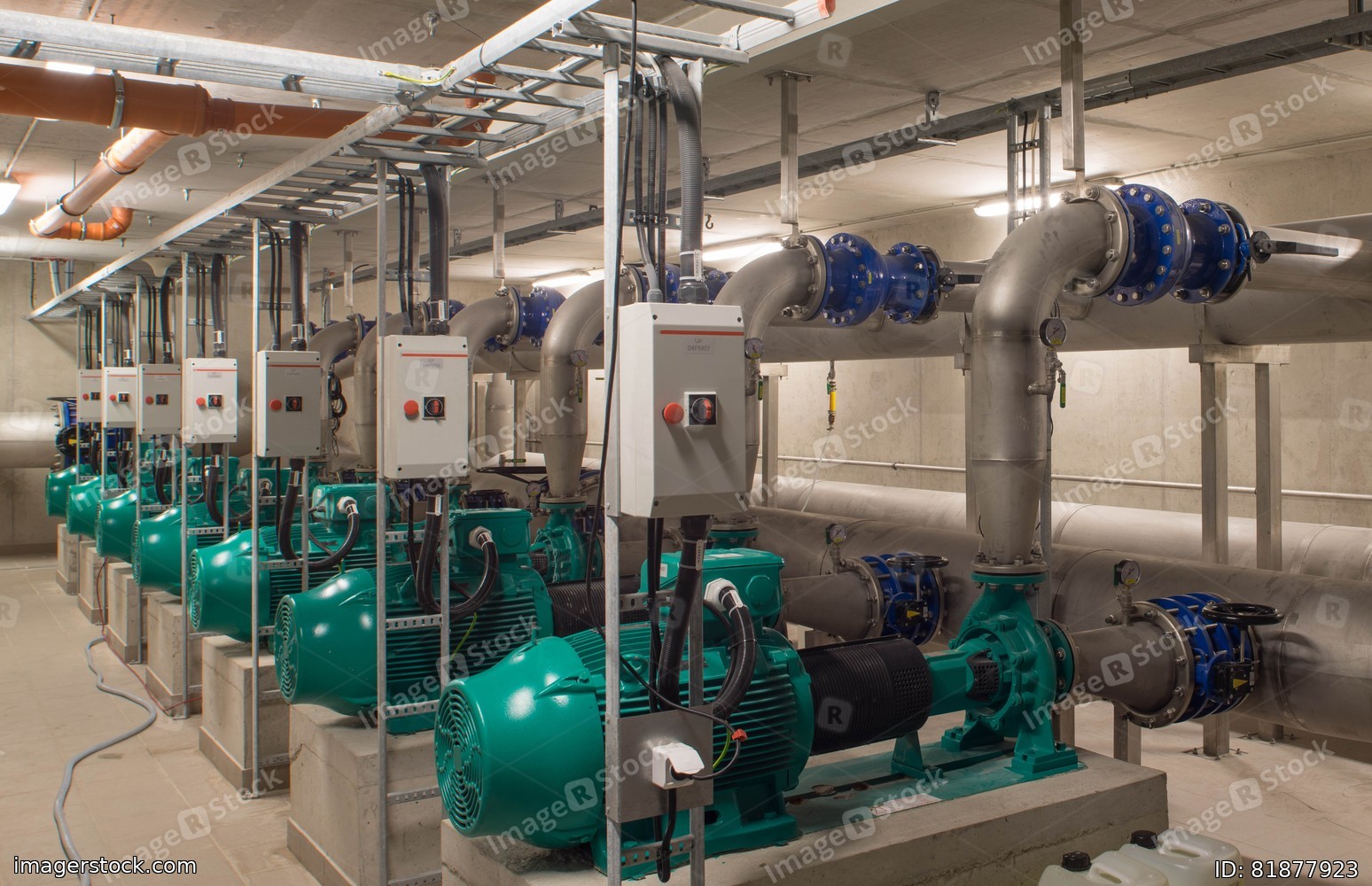 Interior of industrial water treatment and boiler room. Single-stage, low-pressure centrifugal pump. Heating system.