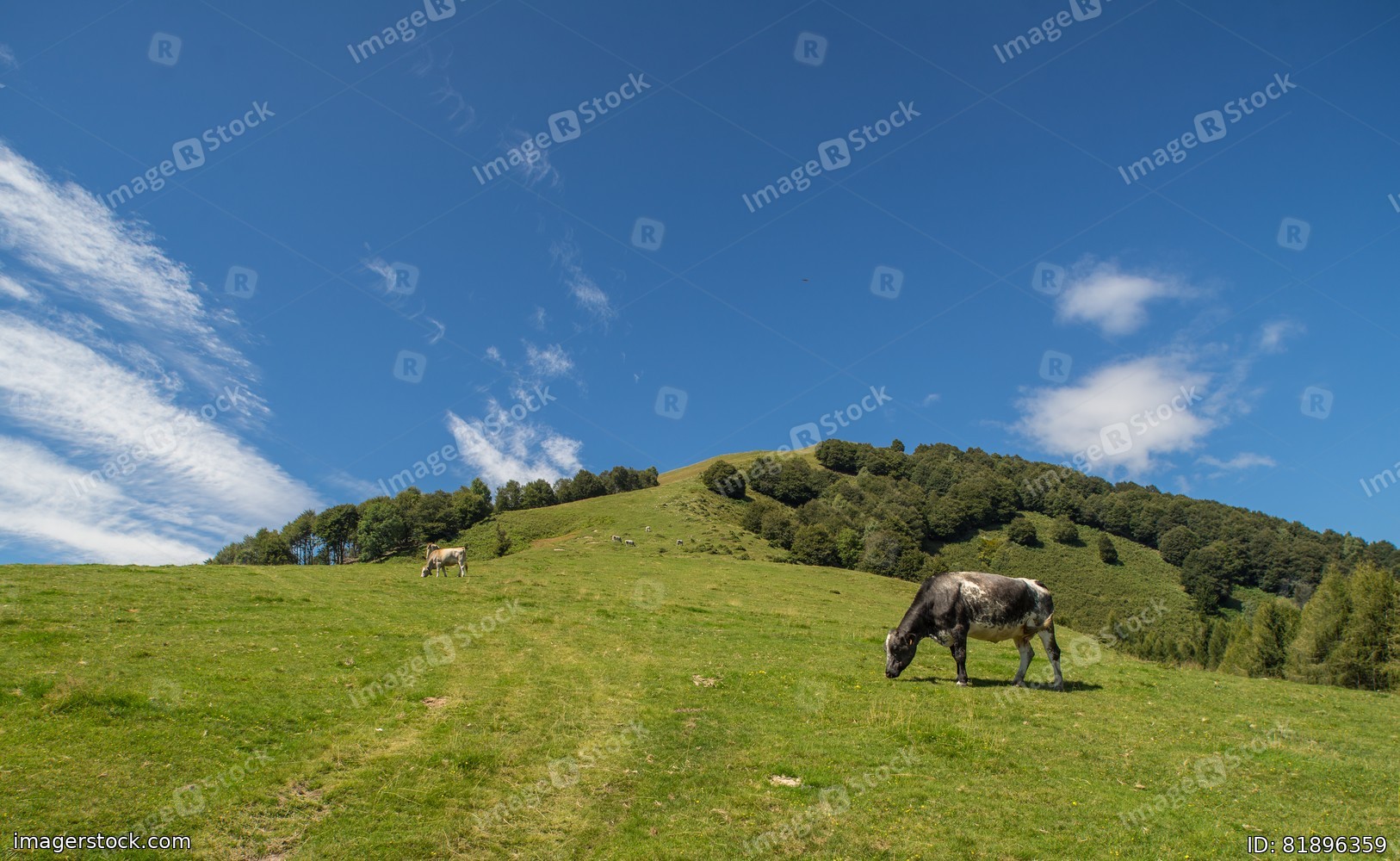 The pasture in the mountains. Cows grazing on the hills. Italy.