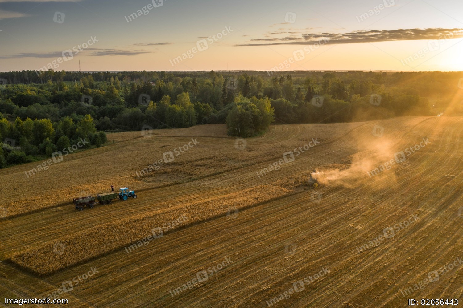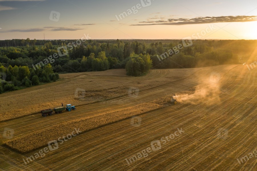 View from above. Combine harvester. Agricultural landscape.