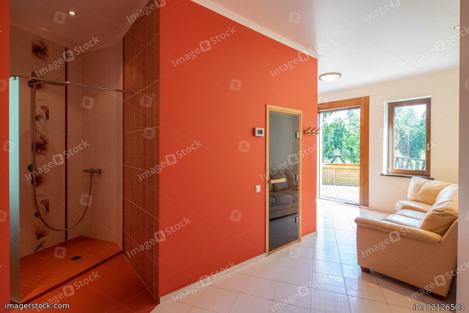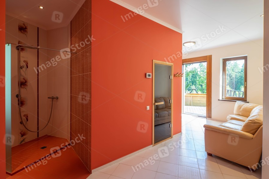 Modern interior of hall in luxury private house. Cozy couch. Shower cabin. Red wall.