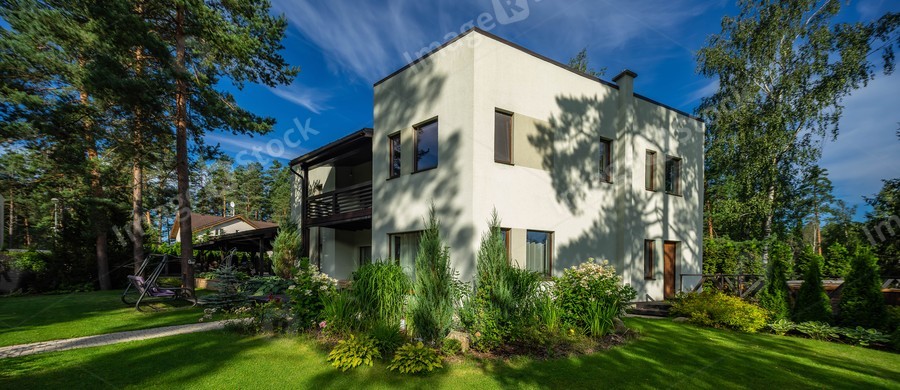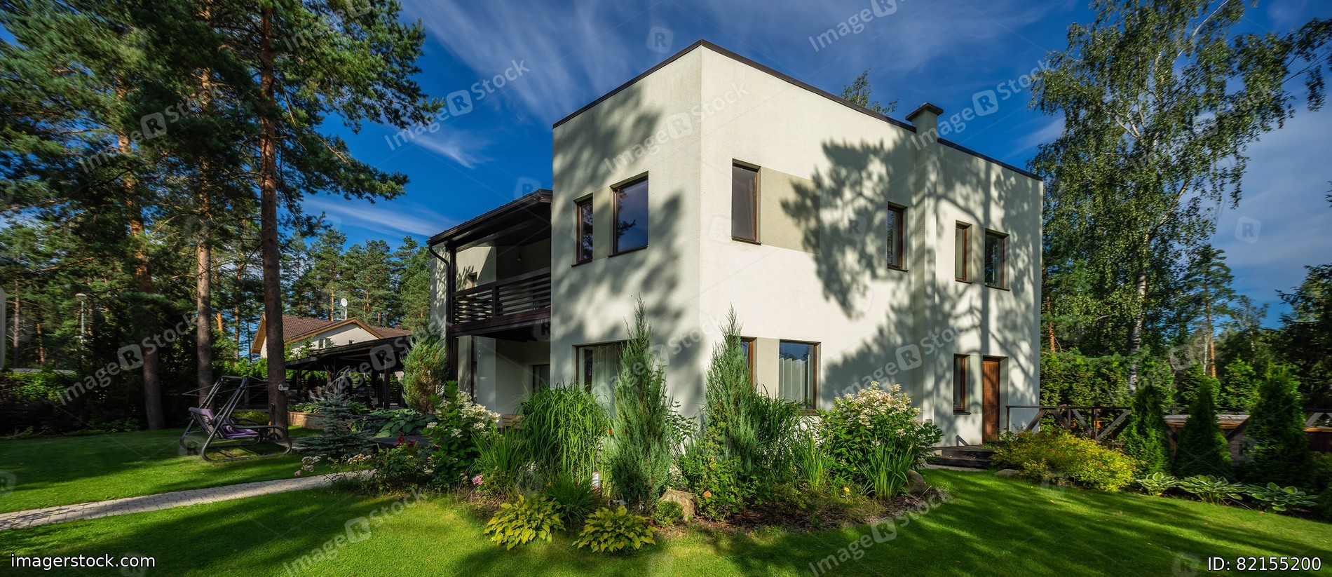 Modern exterior of luxury cottage with wooden terrace. Swing in garden. Huge pines, green grass. Blue sky. Sunny summer day.