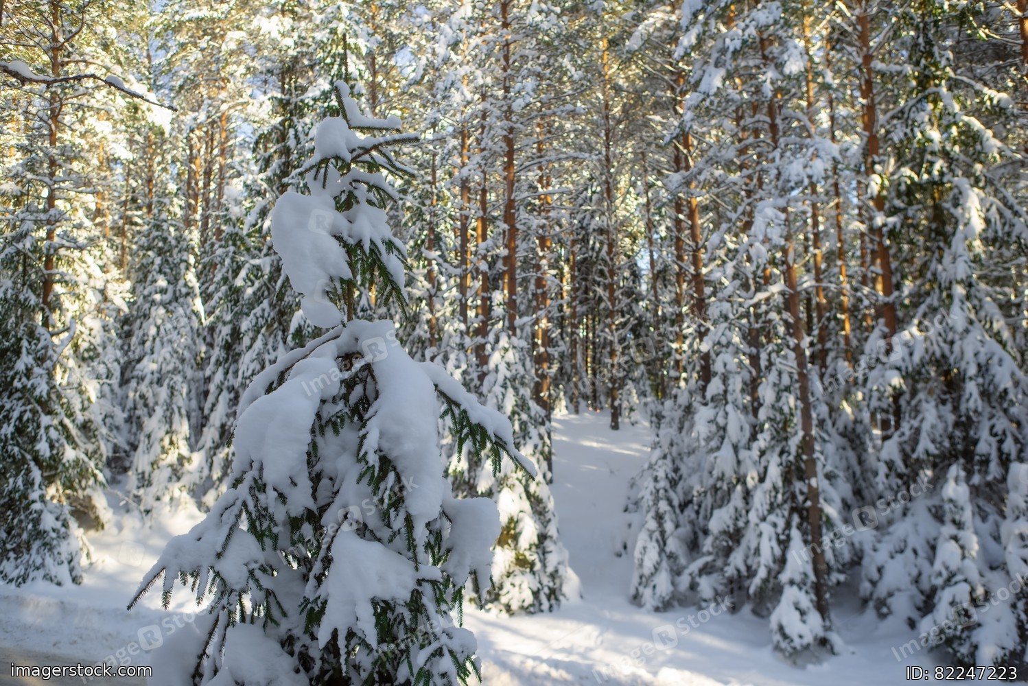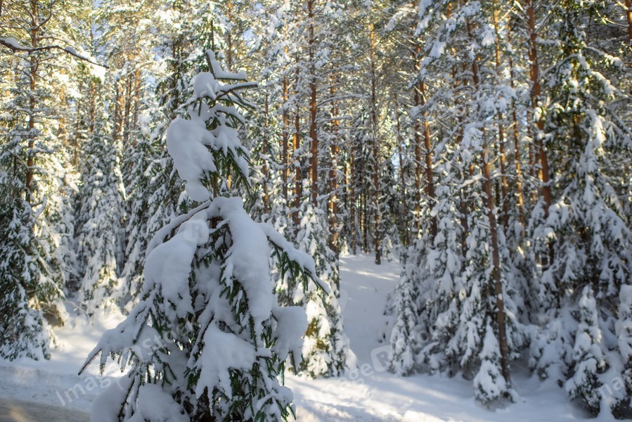 Scenic landscape of winter forest. Trees covered by snow.