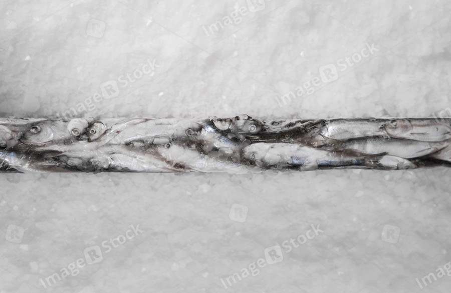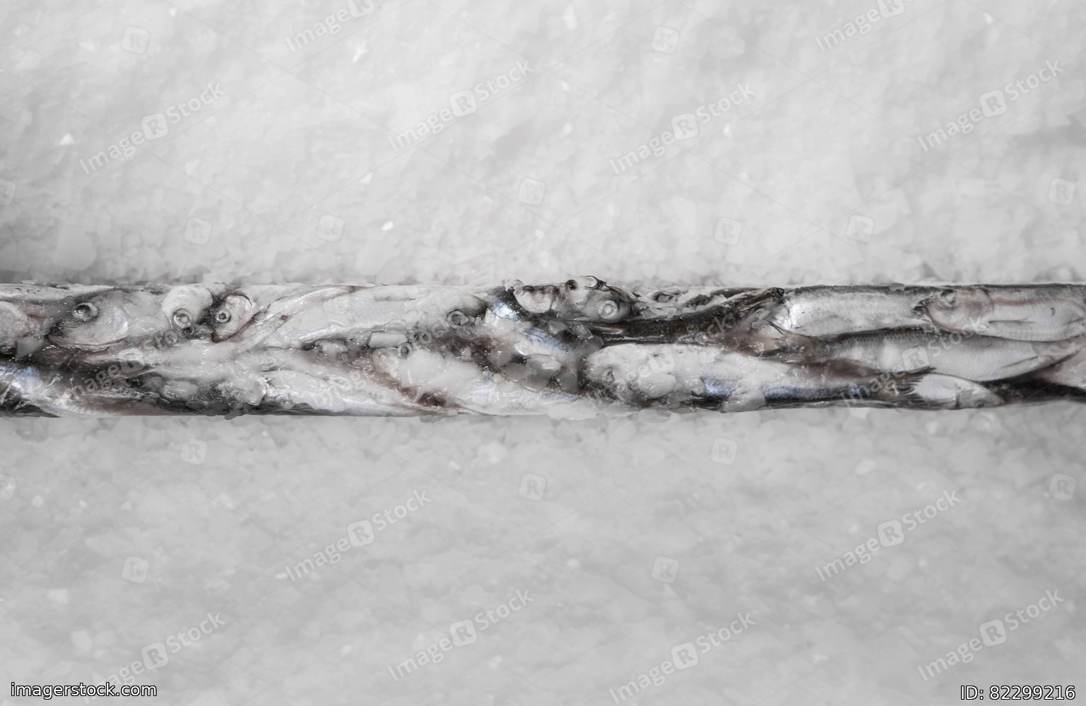 Close-up of sprat brick on the ice in fish market. Winter fishing. Frozen small silver fish. Top side view.