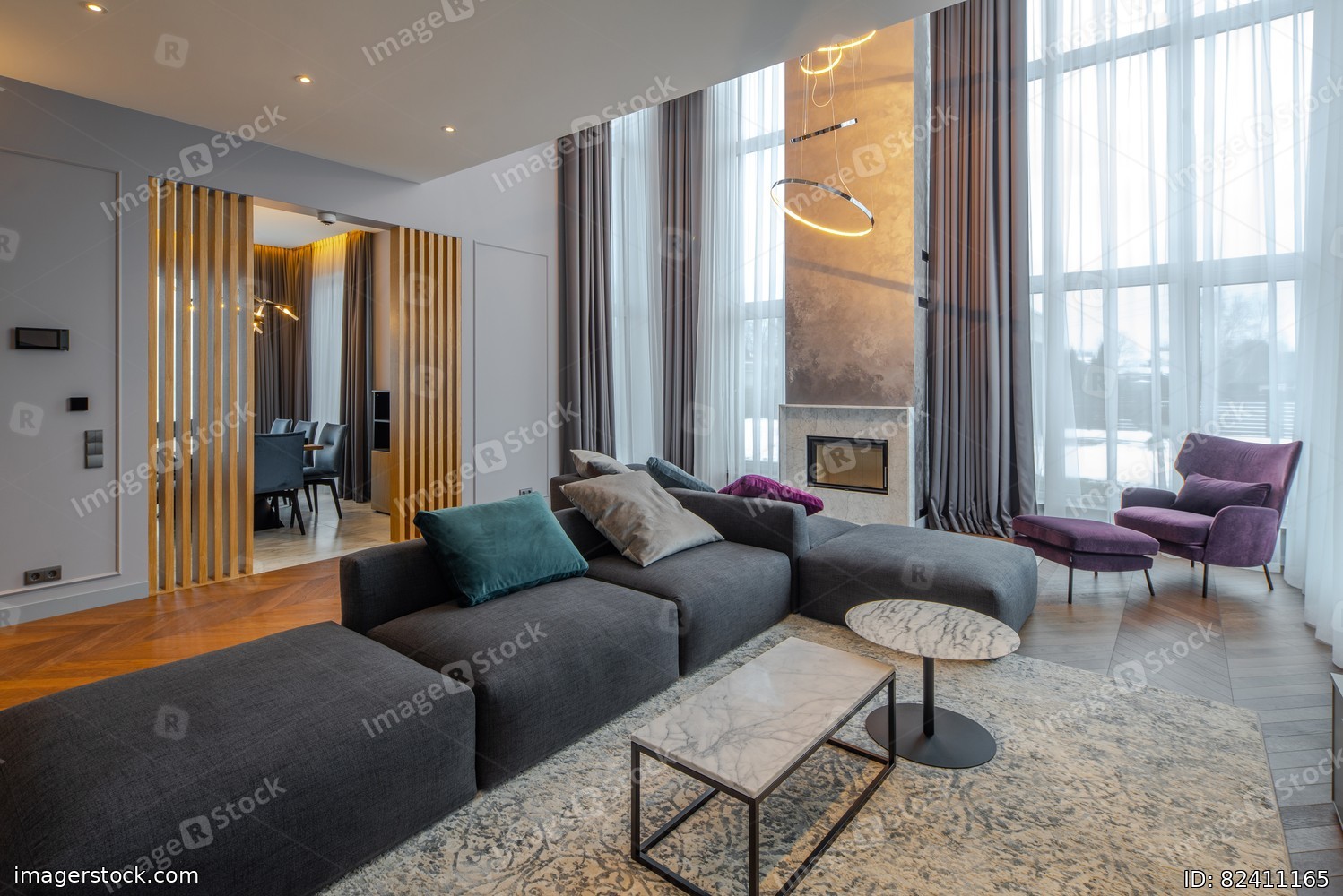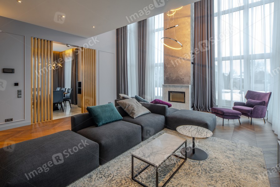 Interior of luxury apartment. Cozy sofa. Huge windows. Fireplace.
