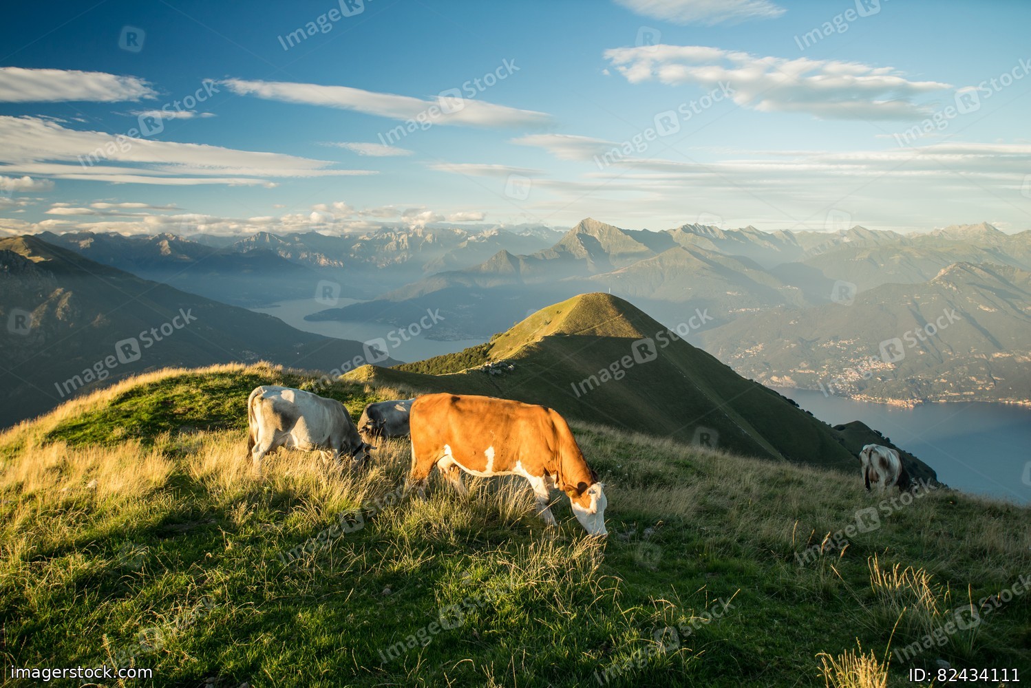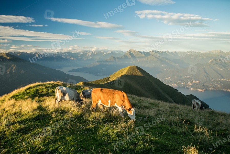 The pasture in the mountains. Cows grazing on the hills. Italy.
