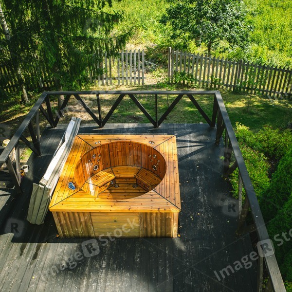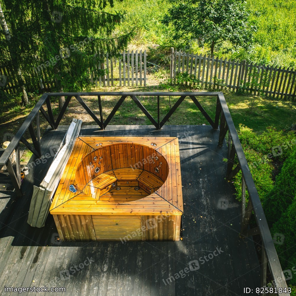 Wooden bath tub on terrace in private garden. Green trees and grass.