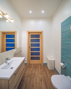 Luxury interior of modern bathroom in apartment. Clean toilet and bidet. Patterned tile.