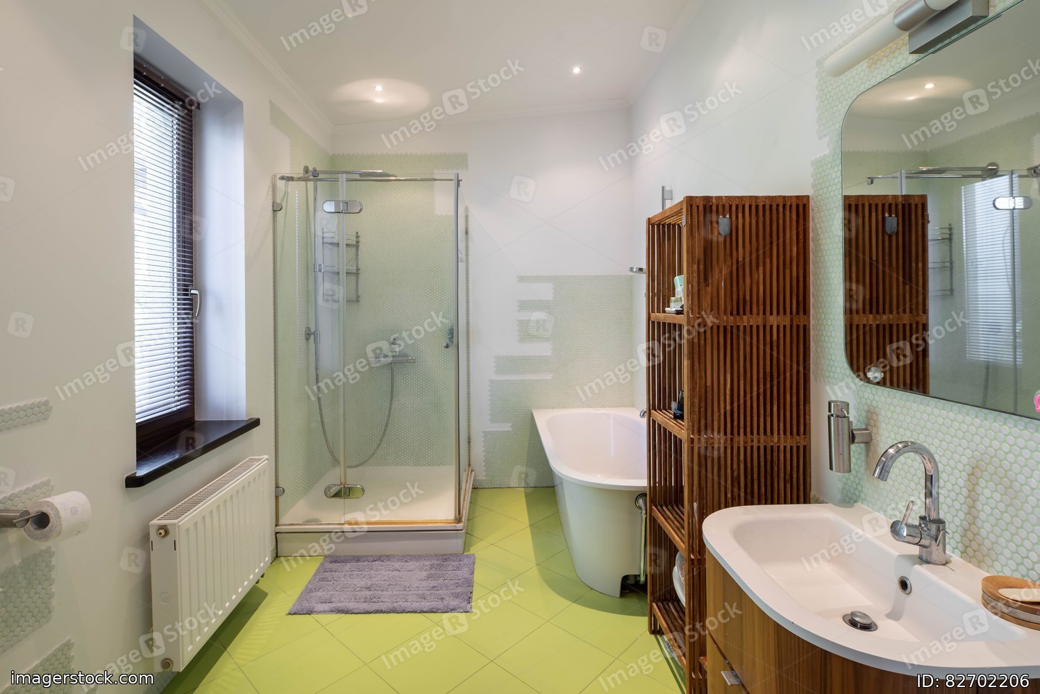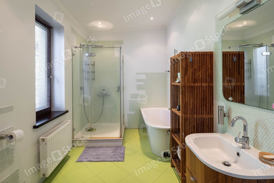 Contemporary interior of bathroom in private house. Bath and glass shower cabin. Wooden bamboo shelf.