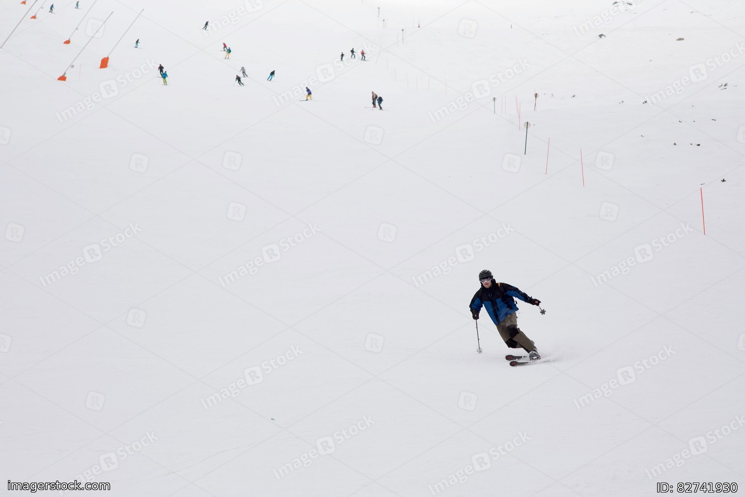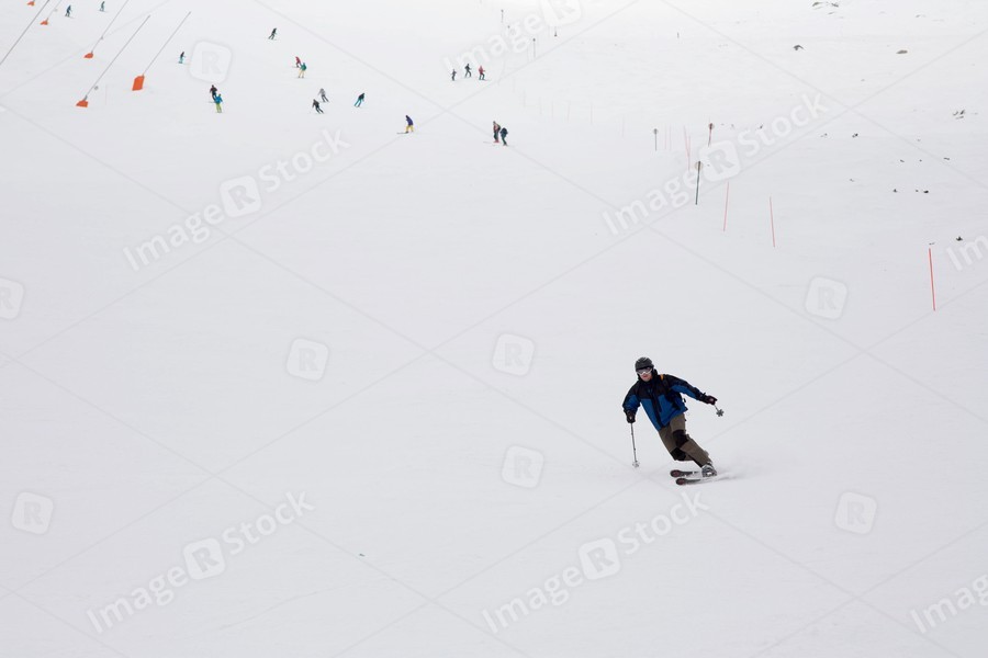 A man goes skiing first on a snow-covered ski track. Ski resort. Fast moving. All people behind. Winter sport.
