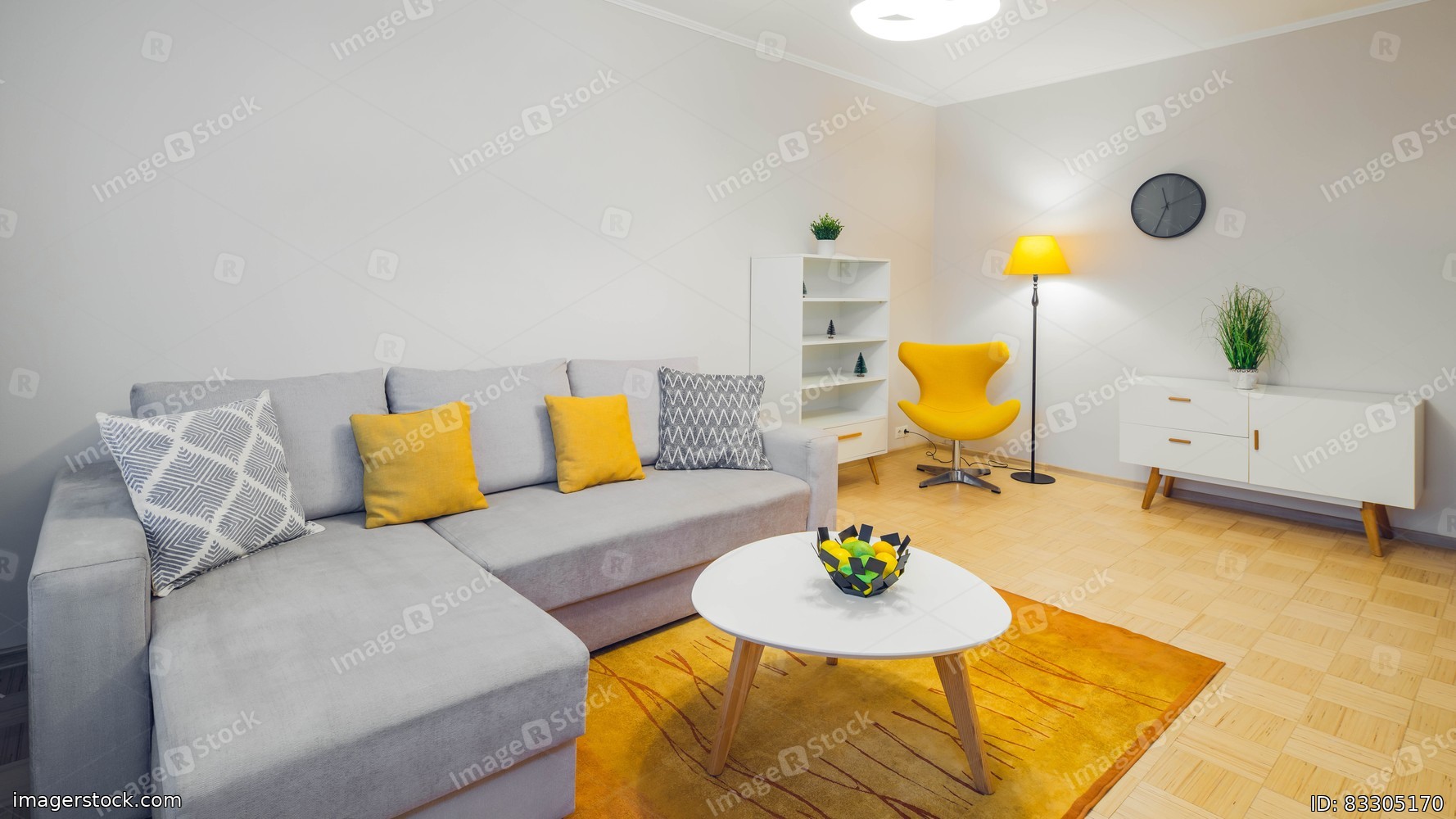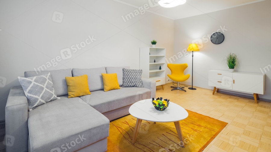 Modern interior of living room. Stylish home decor. Cozy sofa and yellow chair. Coffee table. White shelf.