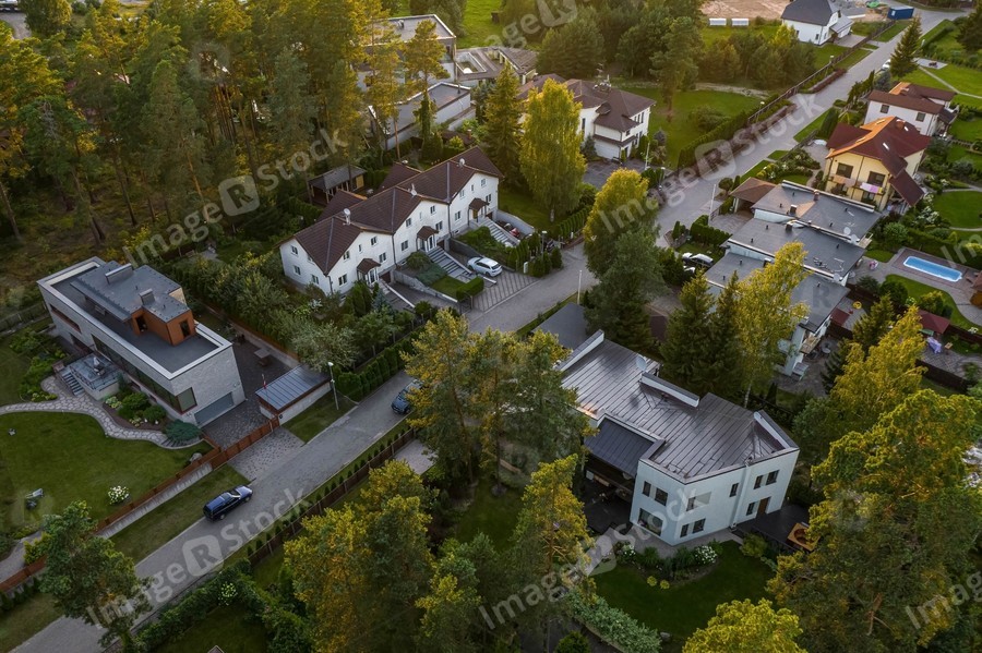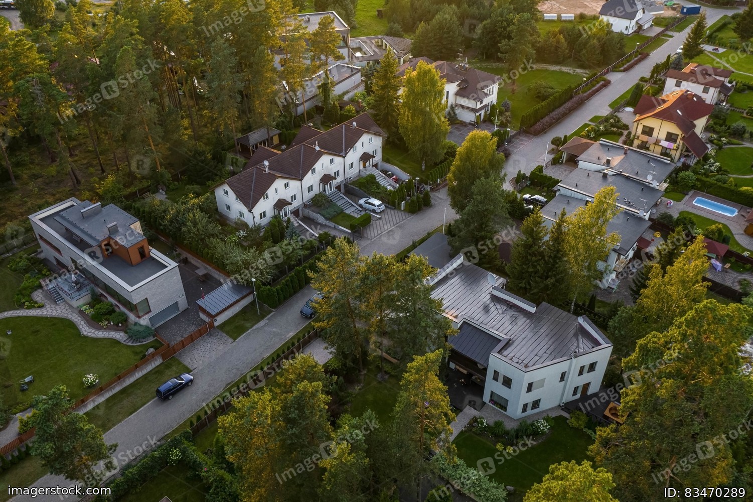 Top drone view of private sector of modern city. Luxury architecture. Road and houses. Green trees.