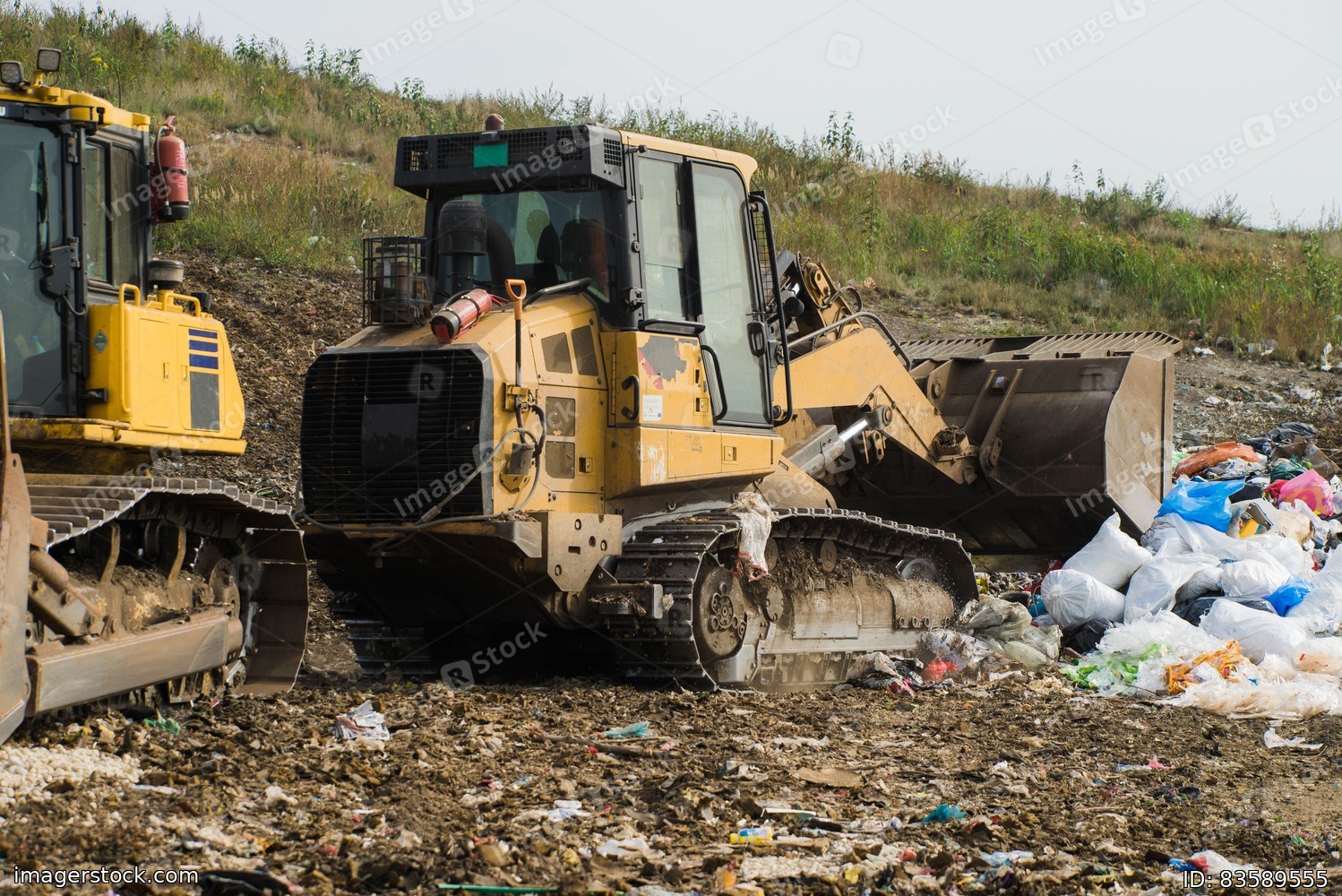 Yellow tractors. Pile of household garbage. Waste sorting and preparation for recycling on landfill. Caring for environment.