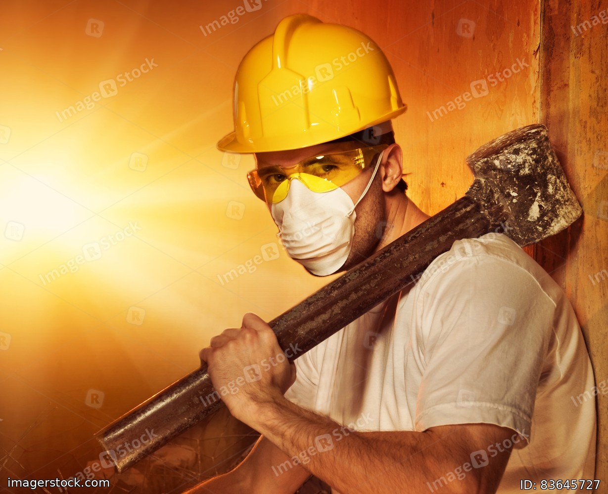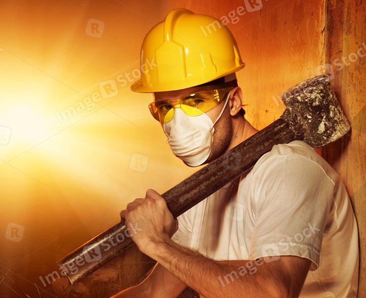 Builder with big metal hammer