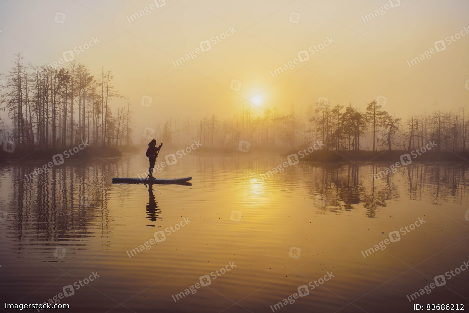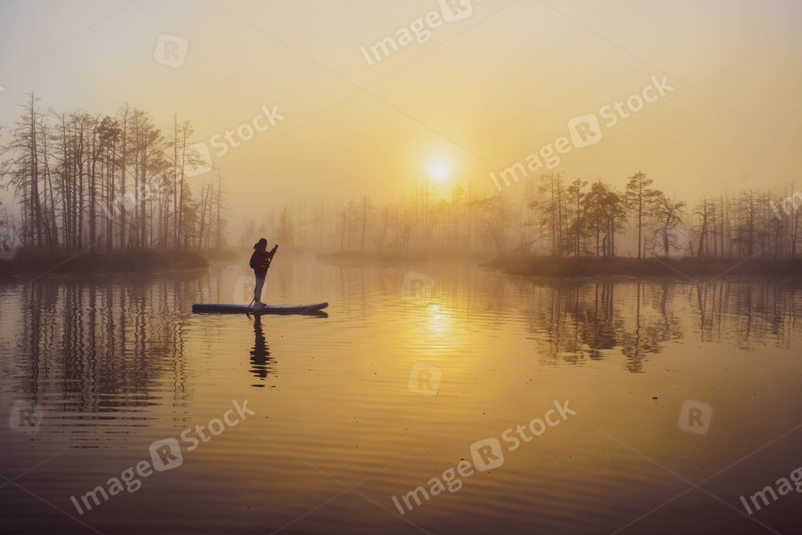 Woman slowly floating on the water on the sup-board. Fog and swamp.