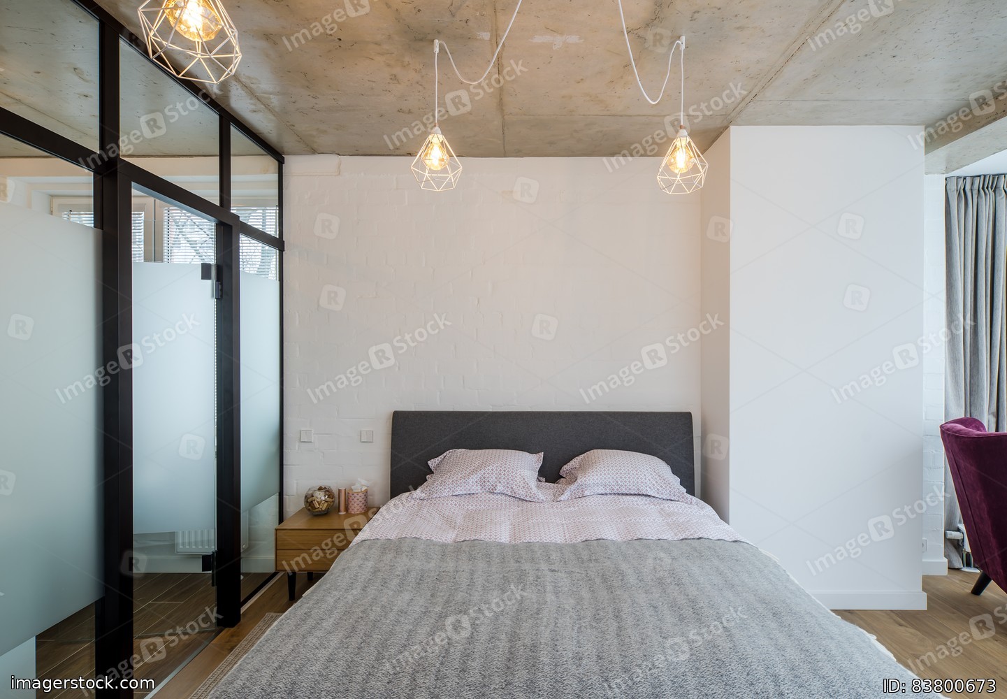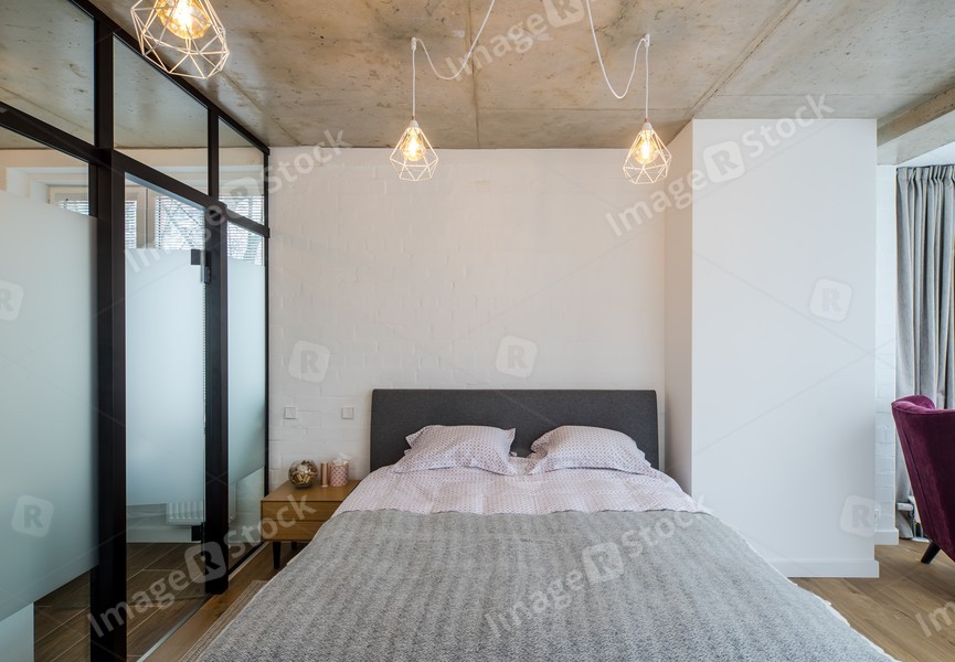 Interior bedroom in the apartment. Concrete ceilings, wooden floor.