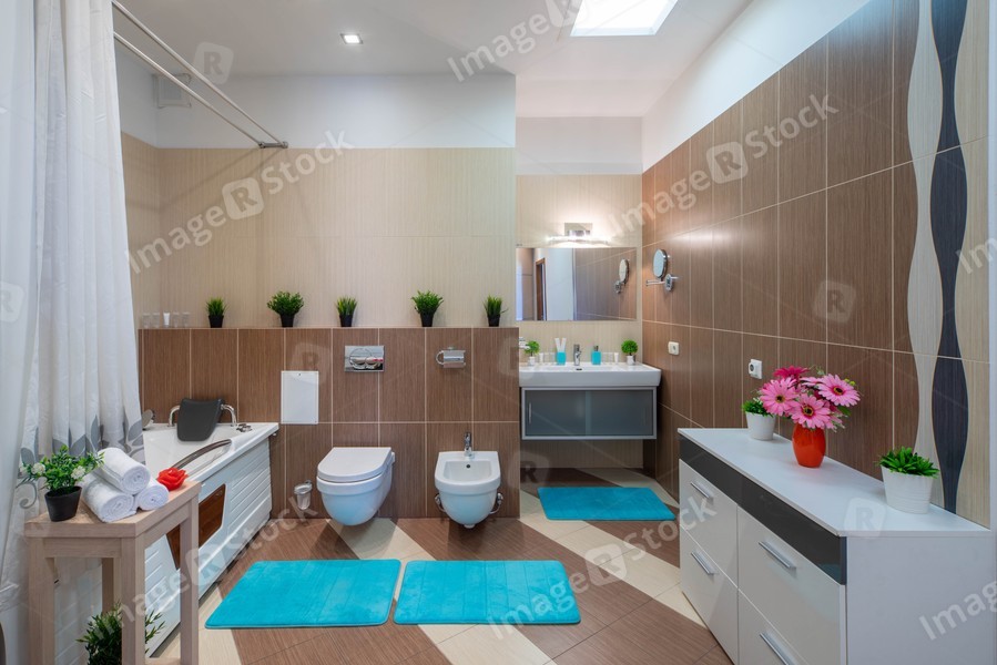 Brown and beige tile. Interior of bathroom in private house. Toilet and bath.
