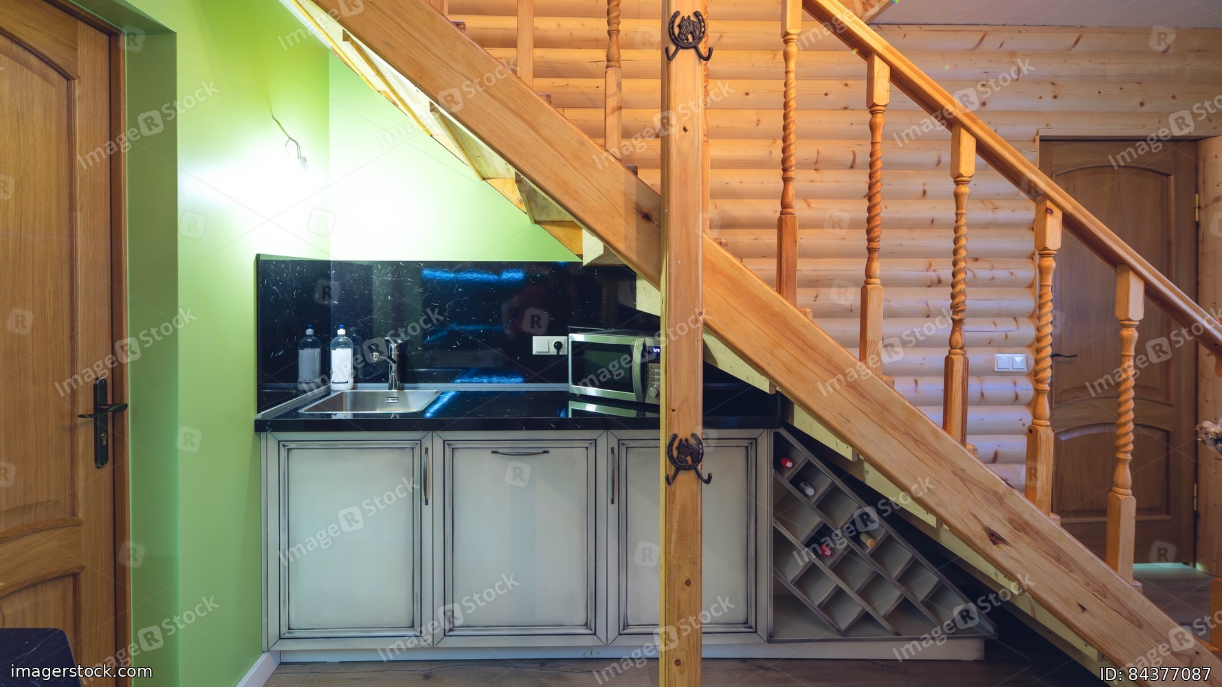 Modern eco interior of country private house. Wooden stairs. White itchen set with sink. Wine shelf.