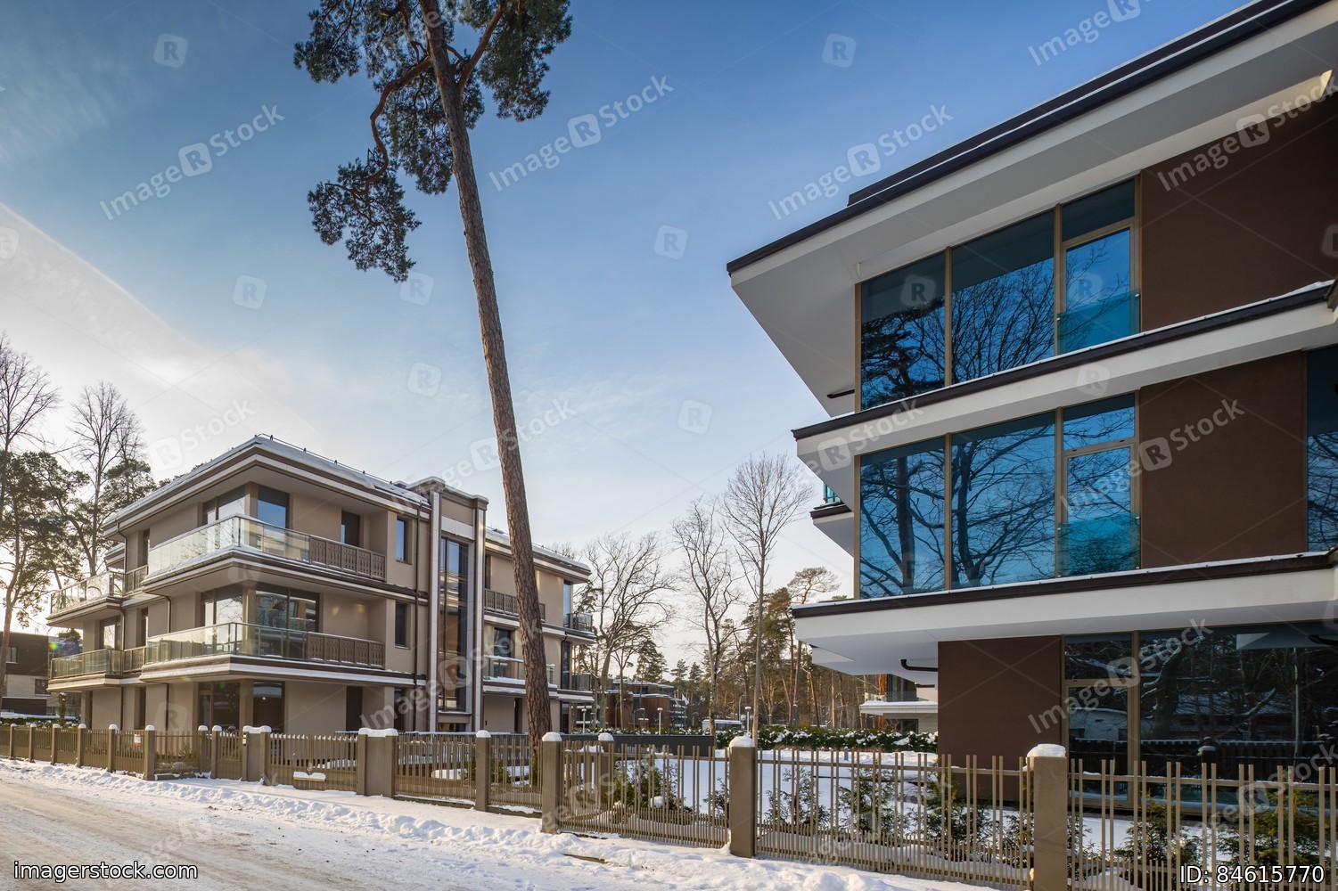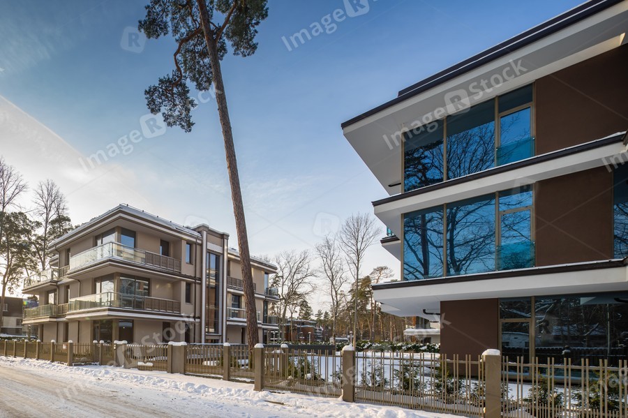 Modern exterior of new luxury residential building at winter.