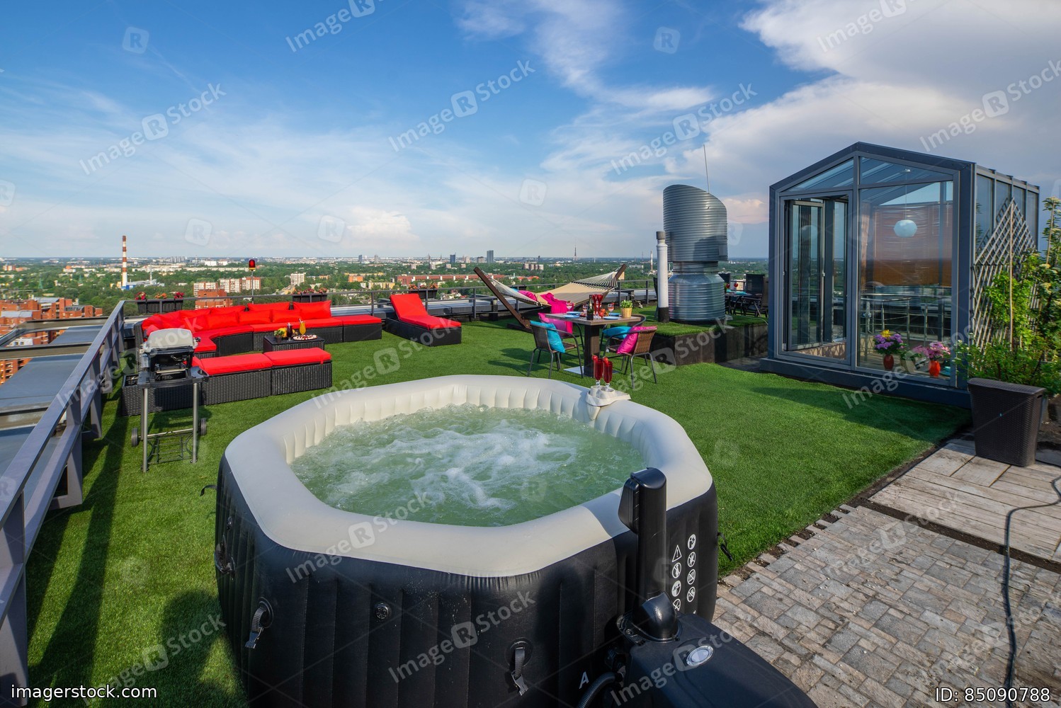 Relaxing zone on the rooftop with furniture and hot tub. Veiw of city from the top.