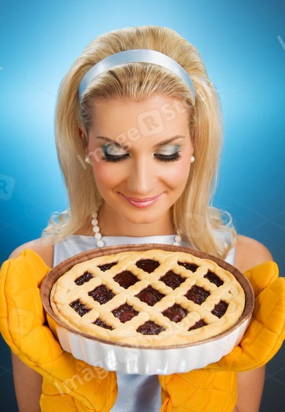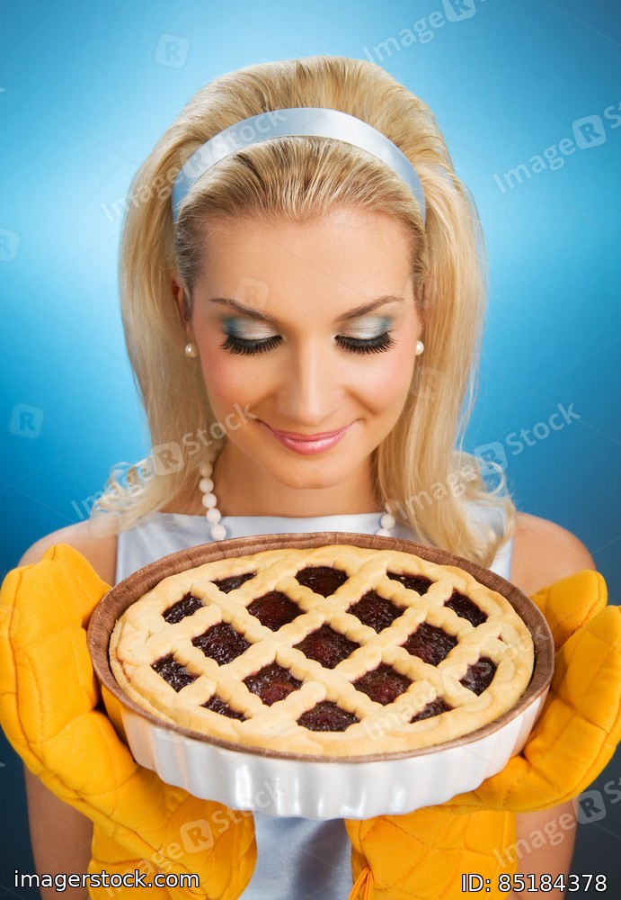 Beautiful woman holding hot italian pie. Retro stylized portrait