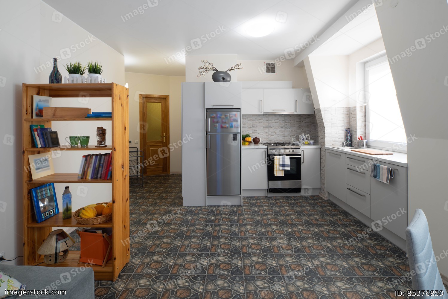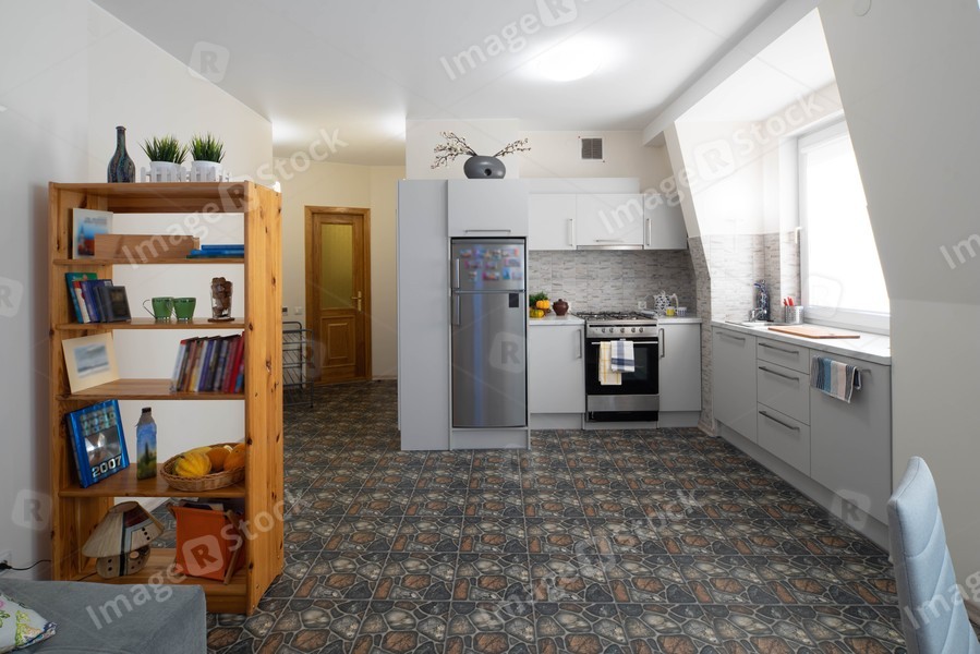 Spacious kitchen. Studio apartment. White walls. Kitchen set. Wooden bookcase.