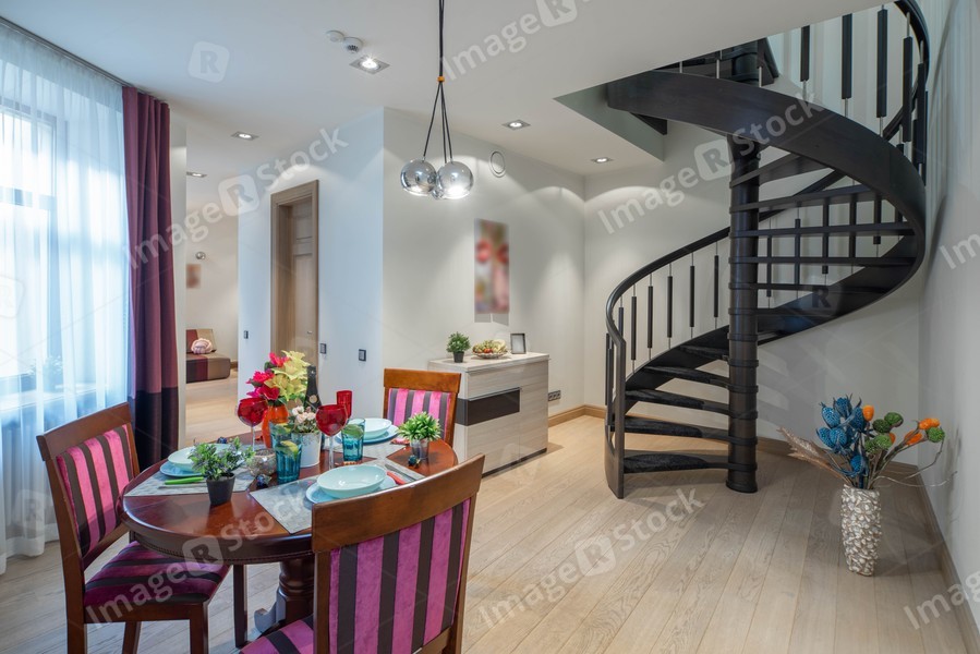 Light studio apartment. Modern interior. Set table. Stairs.