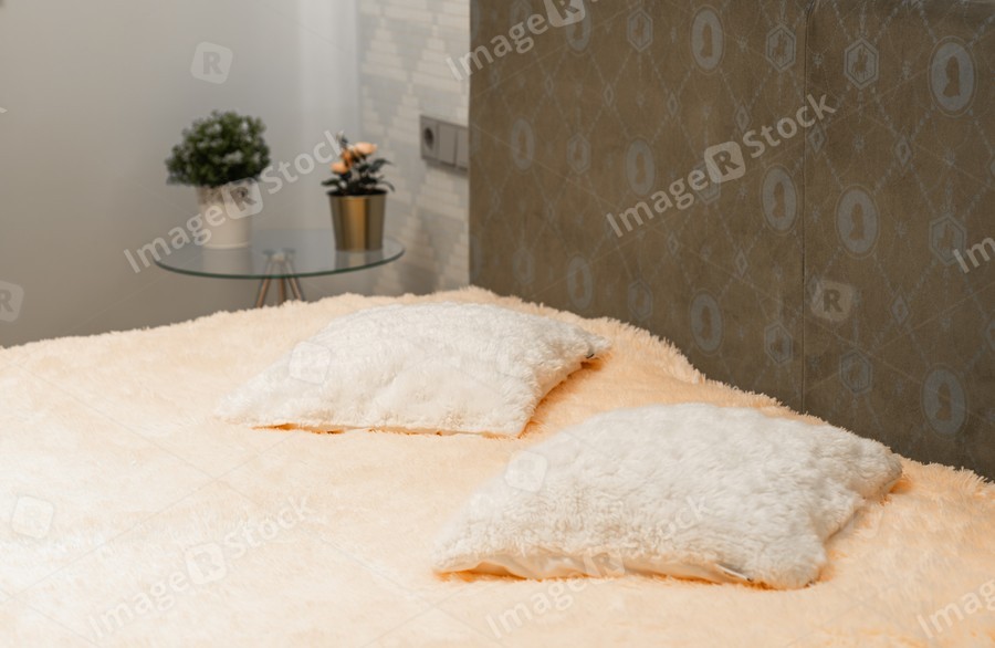 Soft pillow on the bed in modern bedroom. Close-up.