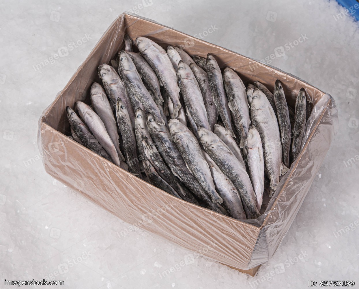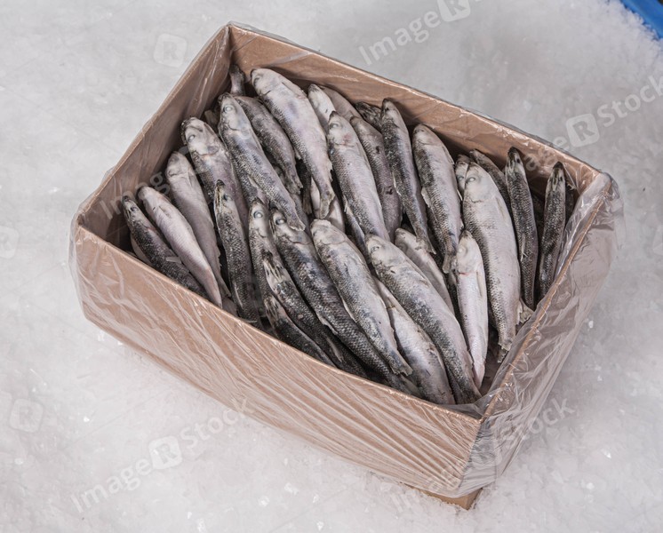 The production of organic fresh fish. A cardbox with a plastic bag. Pieces of ice. Small sprat. Top view.