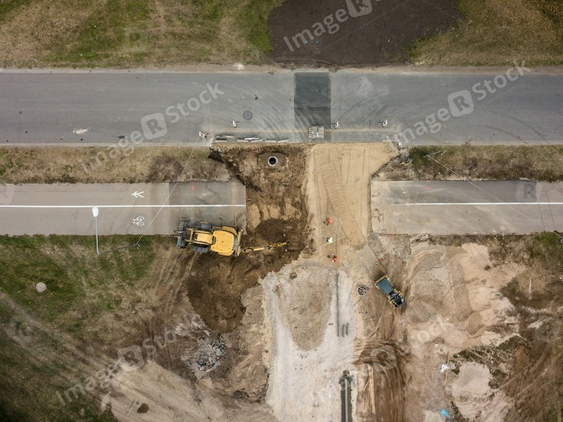 Drone view of road construction works. Yellow excavator and road roller. Asphalt road.