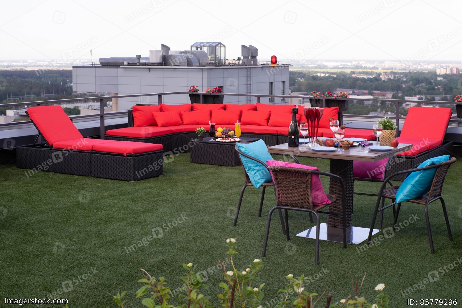 View of city from the rooftop terrace. Relax zone with furniture and jacuzzi.