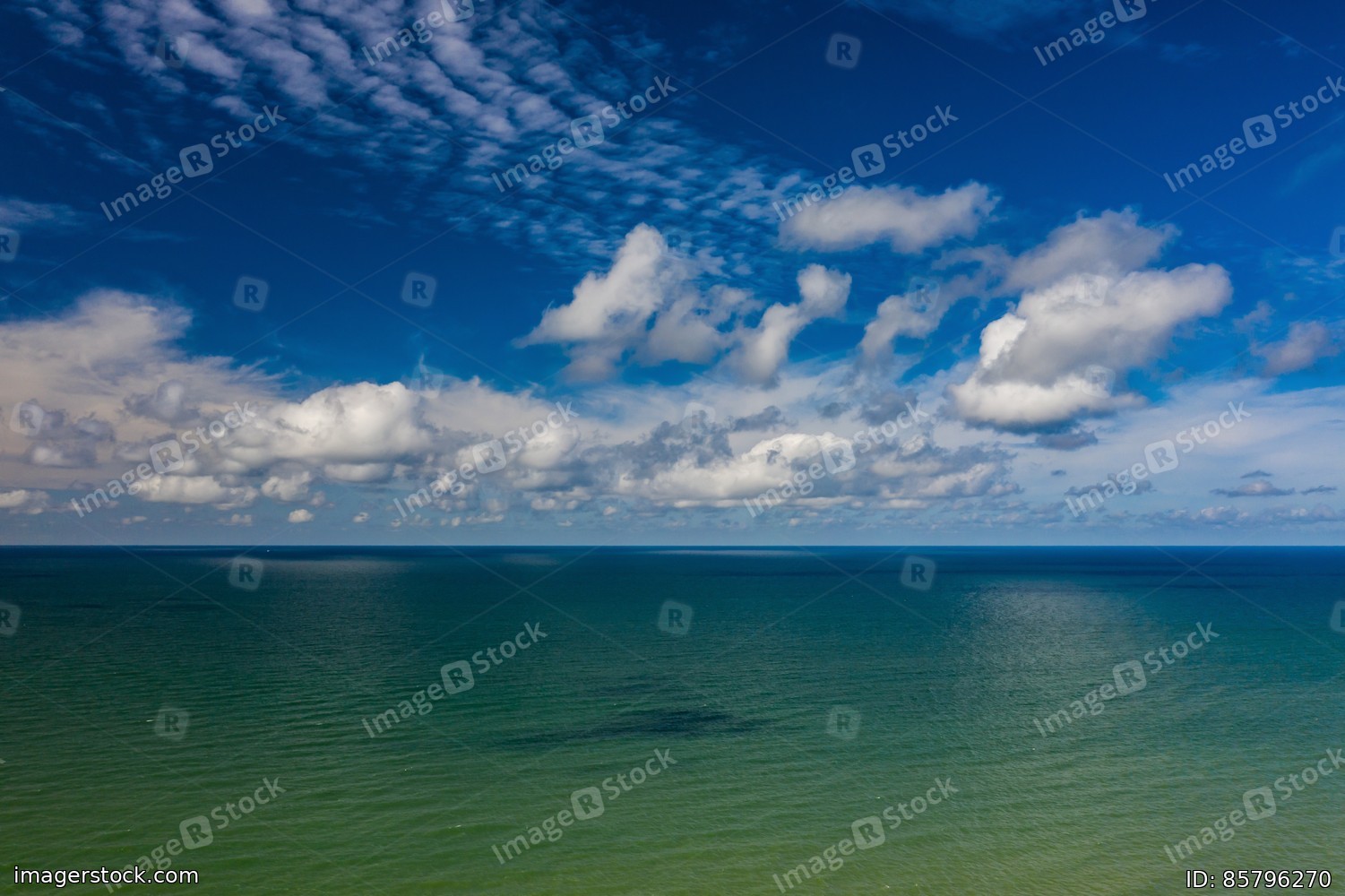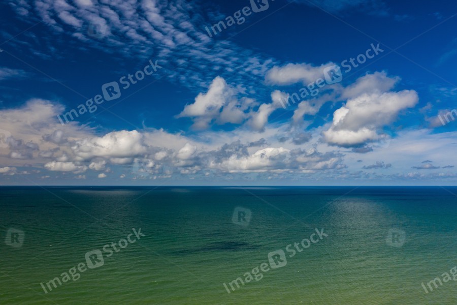 Peaceful sea and cloudy blue sky. Horizon line.