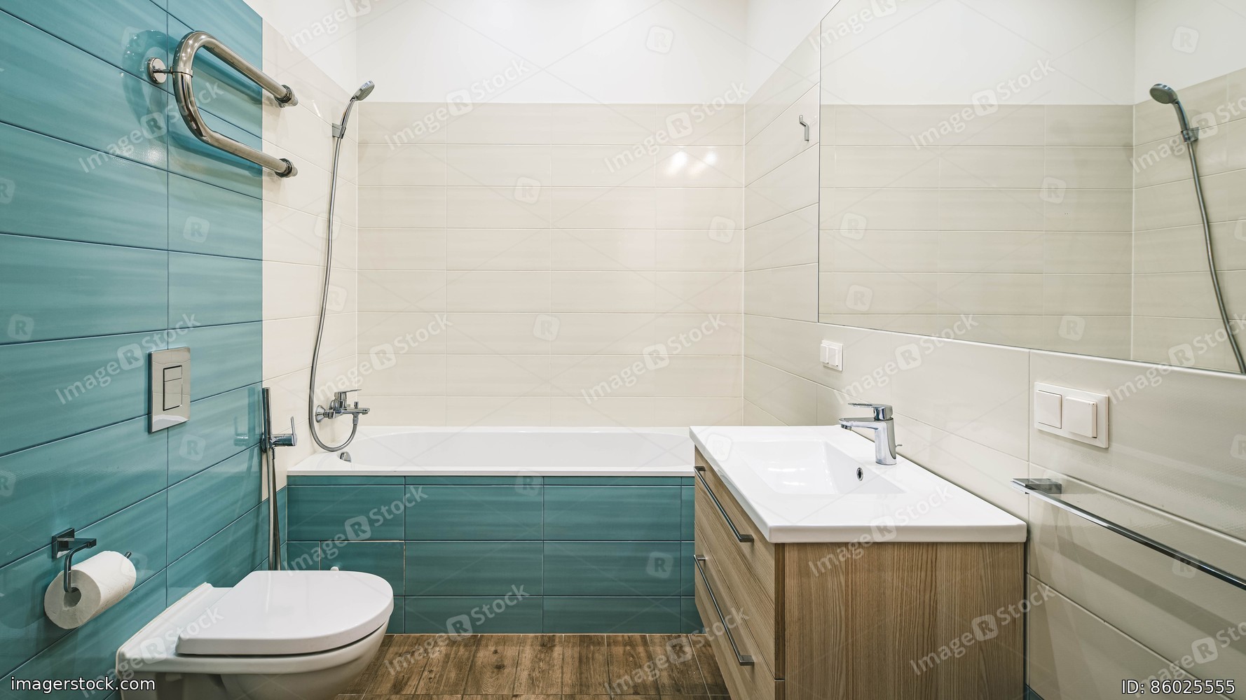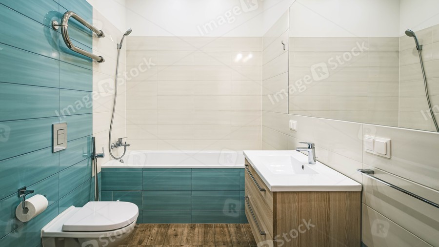Contemporary interior of luxury bathroom in apartment. Mirror and sink with wooden drawers. Bath and toilet.