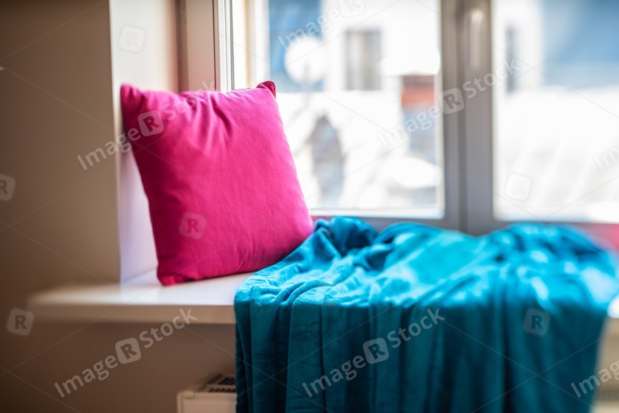 Close-up of pillow on the windowsill. Blue blanket.