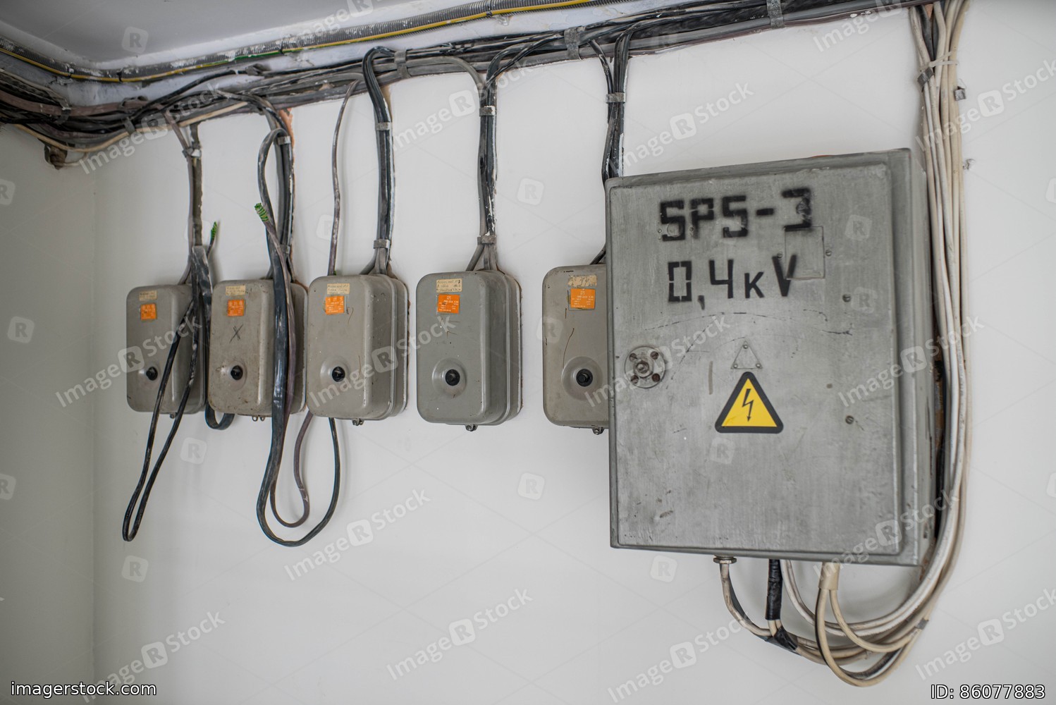 Grey switchers on the white wall. Electricity system.