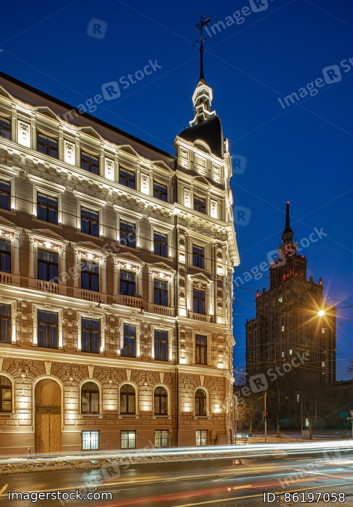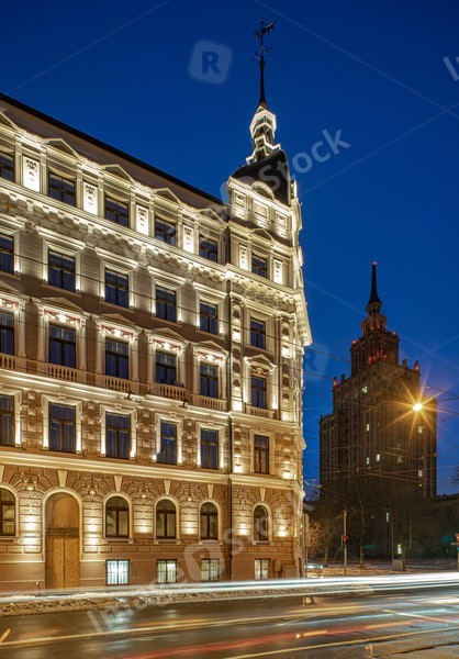 Night cityscape of Riga. Lights on long exposure. Illuminated building