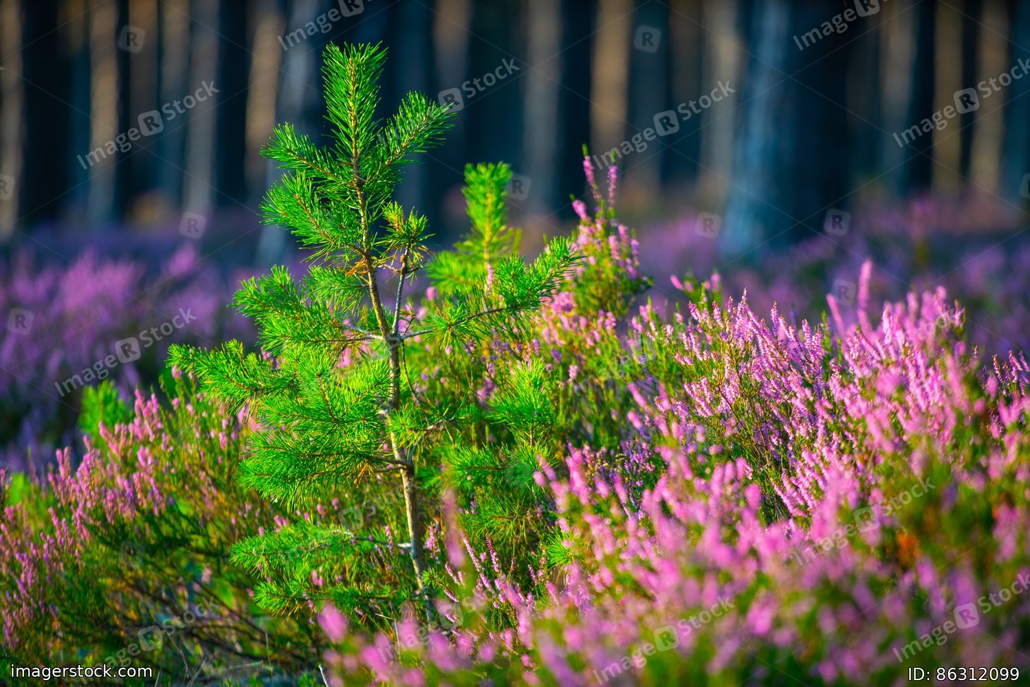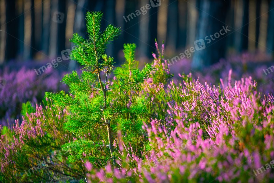 Sunny day. Blooming heather. Beautiful lawn in the forest.